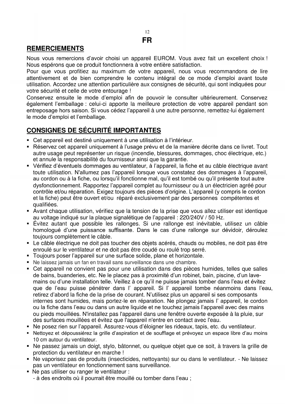 REMERCIEMENTS Nous vous remercions d’avoir choisi un appareil EUROM. Vous avez fait un excellent choix ! Nous espérons que ce produit fonctionnera à votre entière satisfaction. Pour que vous profitiez au maximum de votre appareil, nous vous recommandons de lire attentivement et de bien comprendre le contenu intégral de ce mode d’emploi avant toute utilisation. Accordez une attention particulière aux consignes de sécurité, qui sont indiquées pour votre sécurité et celle de votre entourage ! Conservez ensuite le mode d’emploi afin de pouvoir le consulter ultérieurement. Conservez également l’emballage : celui-ci apporte la meilleure protection de votre appareil pendant son entreposage hors saison. Si vous cédez l’appareil à une autre personne, remettez-lui également le mode d’emploi et l’emballage.