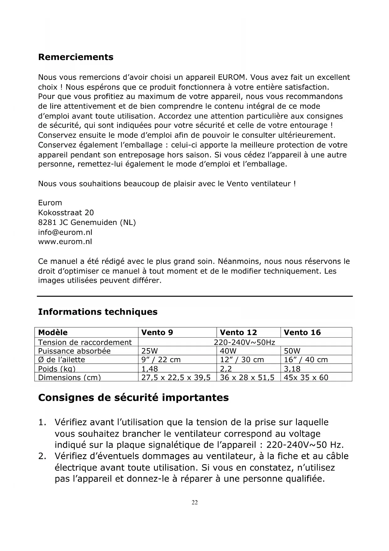 EG-Konformitätserklärung Sehe Seite 34.22 Remerciements Nous vous remercions d’avoir choisi un appareil EUROM. Vous avez fait un excellent choix ! Nous espérons que ce produit fonctionnera à votre entière satisfaction. Pour que vous profitiez au maximum de votre appareil, nous vous recommandons de lire attentivement et de bien comprendre le contenu intégral de ce mode d’emploi avant toute utilisation. Accordez une attention particulière aux consignes de sécurité, qui sont indiquées pour votre sécurité et celle de votre entourage ! Conservez ensuite le mode d’emploi afin de pouvoir le consulter ultérieurement. Conservez également l’emballage : celui-ci apporte la meilleure protection de votre appareil pendant son entreposage hors saison. Si vous cédez l’appareil à une autre personne, remettez-lui également le mode d’emploi et l’emballage. Nous vous souhaitions beaucoup de plaisir avec le Vento ventilateur ! Eurom Kokosstraat 20 8281 JC Genemuiden (NL) info@eurom.nl www.eurom.nl Ce manuel a été rédigé avec le plus grand soin. Néanmoins, nous nous réservons le droit d’optimiser ce manuel à tout moment et de le modifier techniquement. Les images utilisées peuvent différer.