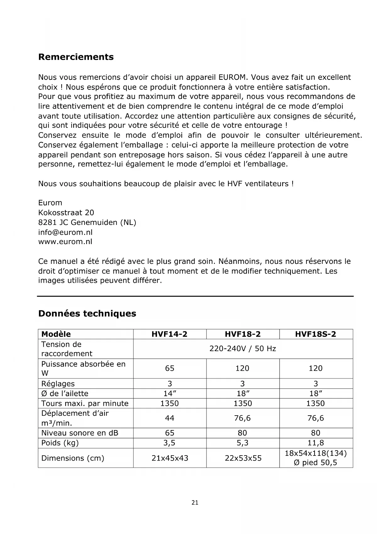 entièrement monté. Fonctionnement Avant d’utiliser l’appareil, assurez-vous que toutes les consignes de sécurité ont été suivies. Bouton de commande (arrière) sur 0 Branchez la fiche dans une prise électrique Sélectionnez la vitesse désirée : 1 = faible (brise agréable) 2 = moyenne (vent fort) 3 = forte (vent violent) Retour à 0 = arrêt Pour débrancher l’appareil, toujours mettre le bouton sur 0 avant de retirer la fiche de la prise électrique ! Ajustement de la direction du soufflement Toujours éteindre le ventilateur, puis enlever la fiche de la prise électrique lorsque vous ajustez la direction du soufflement ! Saisissez la grille de sécurité autour des ailettes du ventilateur avec les deux mains, puis tournez dans la direction souhaitée. Pivoter Les HVF14-2 et HVF18-2 peuvent pivoter de ± 150°, le HVF18S-2 ± 275°. Nettoyage et entretien Eteignez le ventilateur et retirez la fiche de la prise murale lorsque vous souhaitez le nettoyer ou effectuer des travaux de maintenance. Le ventilateur nécessite uniquement un entretien général externe. Époussetez-le régulièrement avec un chiffon doux ou un plumeau ou aspirez-le avec une brosse douce pour aspirateur. Assurez-vous que l'eau ne finisse pas sur les pièces autres que la grille et les plateaux! Ne jamais rincer ou pulvériser le ventilateur! Pour éviter d'endommager, d'endommager ou de déformer le matériau, n'utilisez jamais d'agents abrasifs, agressifs ou corrosifs (de nettoyage). Si vous souhaitez nettoyer le ventilateur à la fin de la saison, faites-le dans son emballage d'origine: il offre la meilleure protection. Rangez-le dans un endroit sûr, sec et pas très chaud ou froid.26 Élimination Au sein de l’UE, ce symbole indique que ce produit ne peut être éliminé avec les déchets ménagers habituels. D’anciens appareils contiennent des matériaux précieux recyclables, qui doivent être reconditionnés pour ne pas nuire à l’environnement et à la santé humaine par une collecte incontrôlée des déchets. Par conséquent, nous vous prions de déposer vos anciens appareils dans un point de collecte destiné à cet effet ou de vous adresser au fournisseur où vous avez acheté l’appareil. Ce dernier veillera à ce qu’un maximum de pièces de l’appareil soient réutilisées. Déclaration CE Par la présente, Eurom - Kokosstraat 20 - 8281 JC – Genemuiden - NL déclare que ventilateurs Eurom de type HVF14-2, HVF18-2 et HVF18S-2 est conforme et conforme aux normes suivantes: LVD 2014/35/EU EN 60335-2-80:2003+A1:2004+A2:2009 EN 60335-1:2012+A11:2014+A13:2017+A1:2019+A14:2019+A2:2019 EN 62233:2008 EMC 2014/30/EU EN 55014-1:2017 EN 55014-2:2015