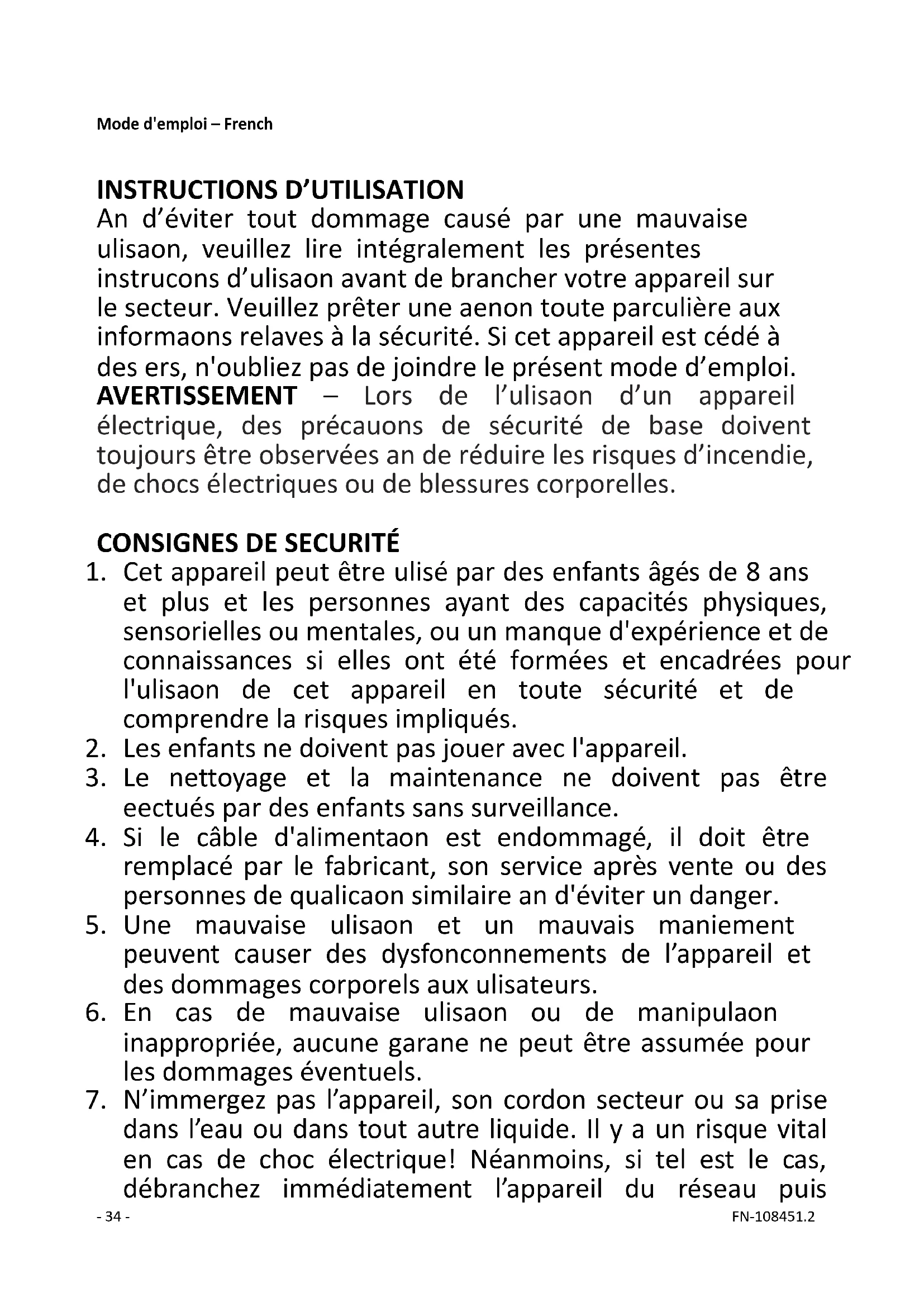 dans l’eau ou dans tout autre liquide. Il y a un risque vital en cas de choc électrique! Néanmoins, si tel est le cas, débranchez immédiatement l’appareil du réseau puis- 35 - FN-108451.2 faites-le vérifier par un spécialiste avant de l’utiliser à nouveau.