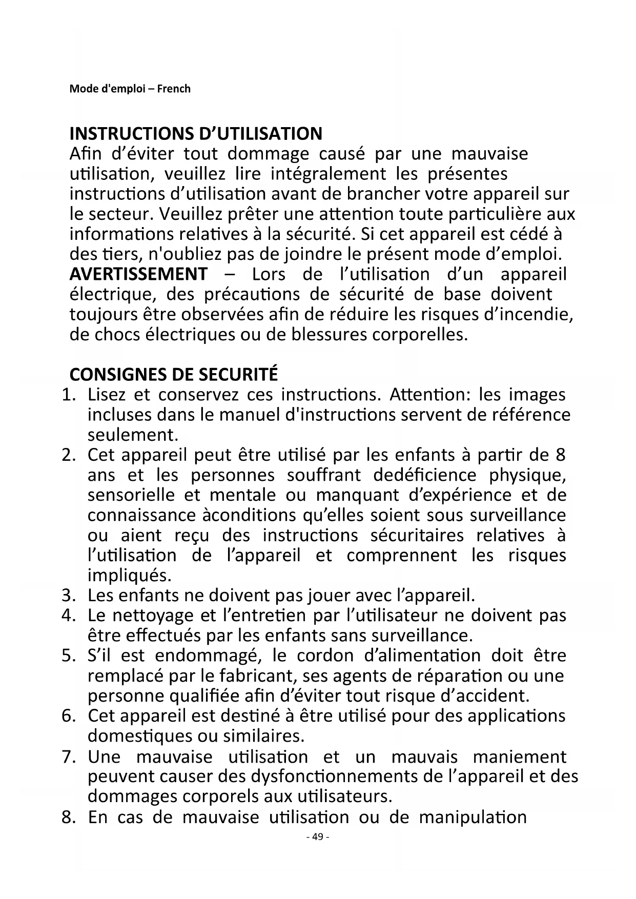 Afin d’éviter tout dommage causé par une mauvaise utilisation, veuillez lire intégralement les présentes instructions d’utilisation avant de brancher votre appareil sur le secteur. Veuillez prêter une attention toute particulière aux informations relatives à la sécurité. Si cet appareil est cédé à des tiers, n'oubliez pas de joindre le présent mode d’emploi. AVERTISSEMENT – Lors de l’utilisation d’un appareil électrique, des précautions de sécurité de base doivent toujours être observées afin de réduire les risques d’incendie, de chocs électriques ou de blessures corporelles.