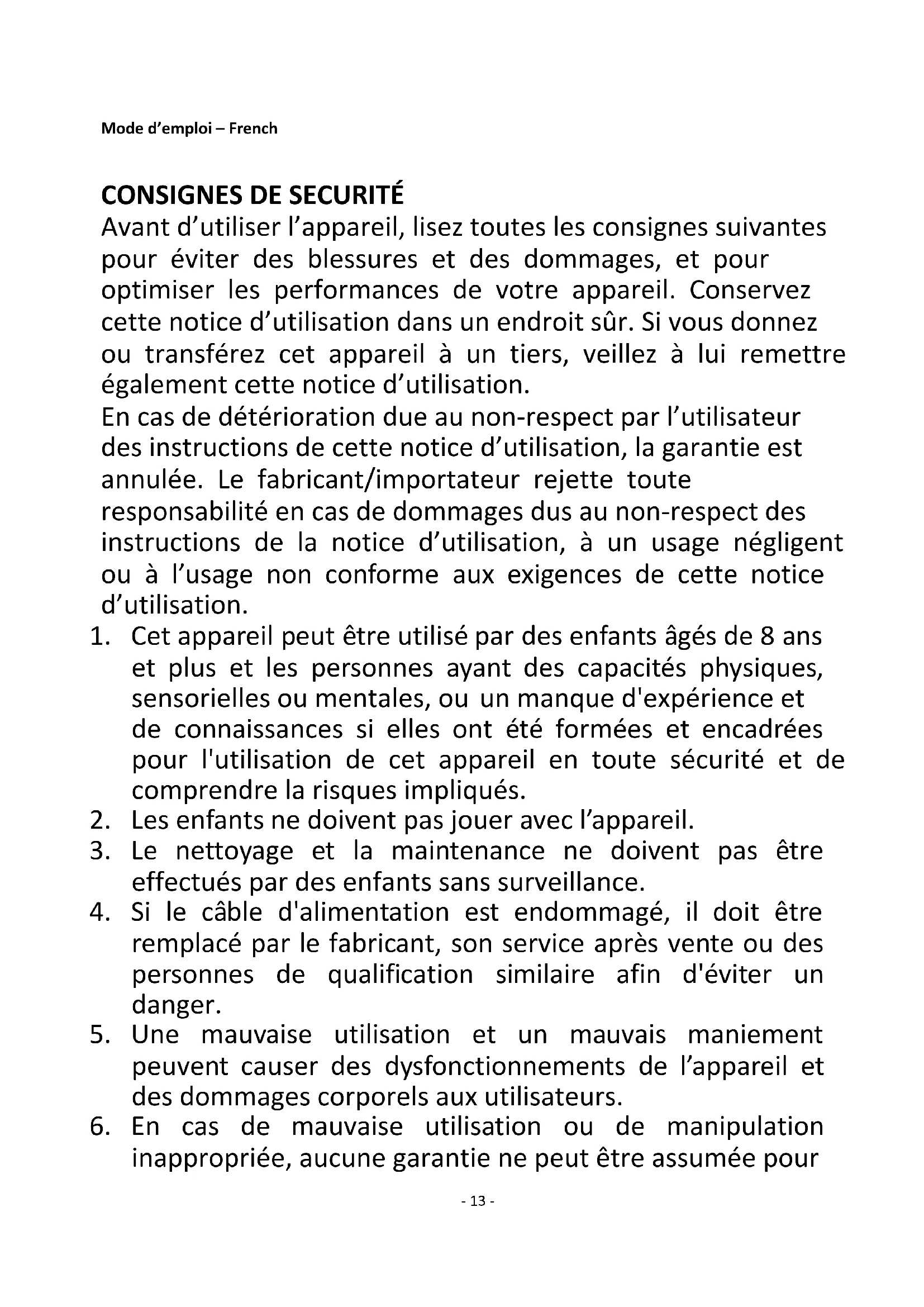 Avant d’utiliser l’appareil, lisez toutes les consignes suivantes pour éviter des blessures et des dommages, et pour optimiser les performances de votre appareil. Conservez cette notice d’utilisation dans un endroit sûr. Si vous donnez ou transférez cet appareil à un tiers, veillez à lui remettre également cette notice d’utilisation. En cas de détérioration due au non-respect par l’utilisateur des instructions de cette notice d’utilisation, la garantie est annulée. Le fabricant/importateur rejette toute responsabilité en cas de dommages dus au non-respect des instructions de la notice d’utilisation, à un usage négligent ou à l’usage non conforme aux exigences de cette notice d’utilisation.