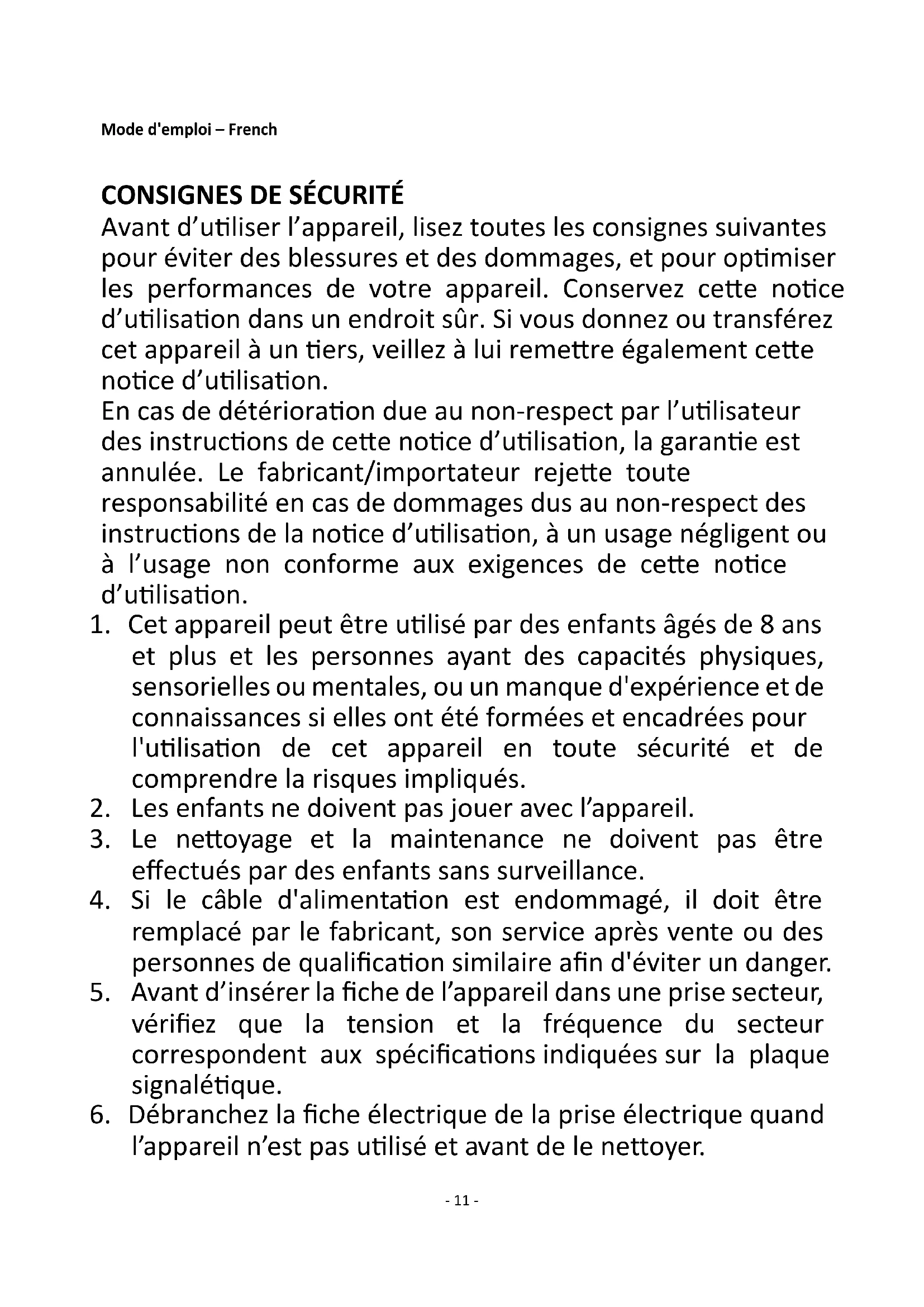 Avant d’utiliser l’appareil, lisez toutes les consignes suivantes pour éviter des blessures et des dommages, et pour optimiser les performances de votre appareil. Conservez cette notice d’utilisation dans un endroit sûr. Si vous donnez ou transférez cet appareil à un tiers, veillez à lui remettre également cette notice d’utilisation. En cas de détérioration due au non-respect par l’utilisateur des instructions de cette notice d’utilisation, la garantie est annulée. Le fabricant/importateur rejette toute responsabilité en cas de dommages dus au non-respect des instructions de la notice d’utilisation, à un usage négligent ou à l’usage non conforme aux exigences de cette notice d’utilisation.