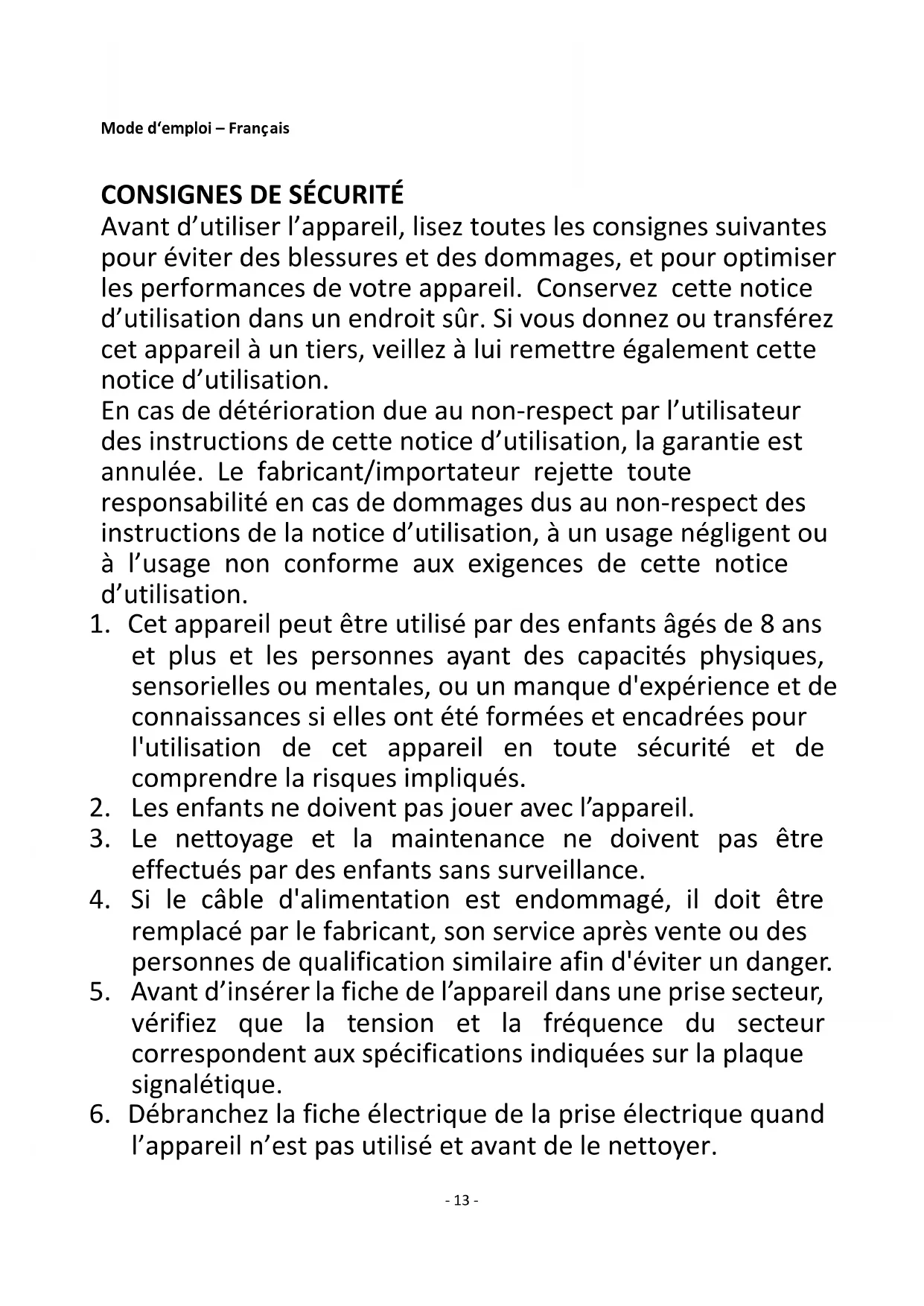 Avant d’utiliser l’appareil, lisez toutes les consignes suivantes pour éviter des blessures et des dommages, et pour optimiser les performances de votre appareil. Conservez cette notice d’utilisation dans un endroit sûr. Si vous donnez ou transférez cet appareil à un tiers, veillez à lui remettre également cette notice d’utilisation. En cas de détérioration due au non-respect par l’utilisateur des instructions de cette notice d’utilisation, la garantie est annulée. Le fabricant/importateur rejette toute responsabilité en cas de dommages dus au non-respect des instructions de la notice d’utilisation, à un usage négligent ou à l’usage non conforme aux exigences de cette notice d’utilisation.