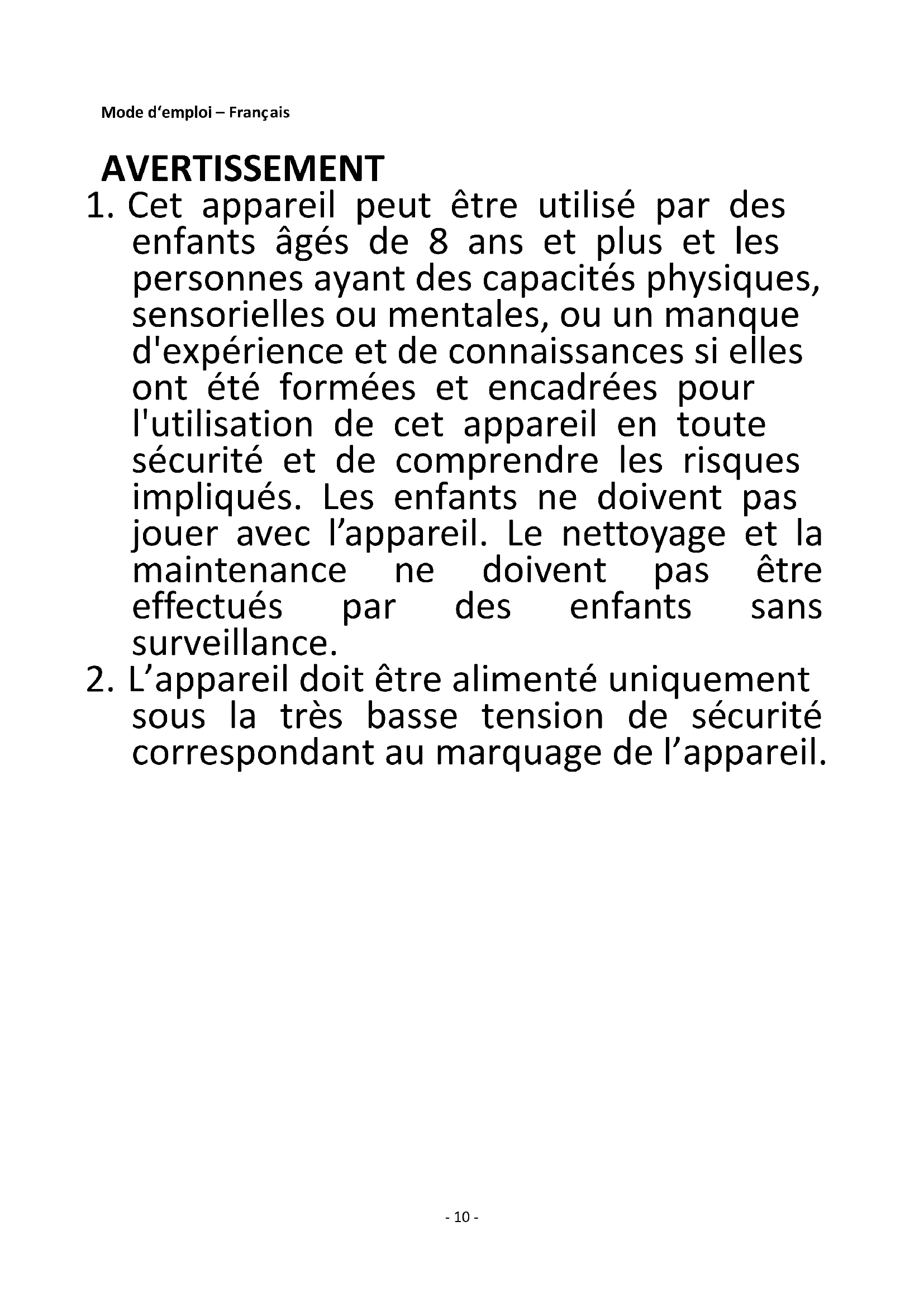 enfants âgés de 8 ans et plus et les personnes ayant des capacités physiques, sensorielles ou mentales, ou un manque d'expérience et de connaissances si elles ont été formées et encadrées pour l'utilisation de cet appareil en toute sécurité et de comprendre les risques impliqués. Les enfants ne doivent pas jouer avec l’appareil. Le nettoyage et la maintenance ne doivent pas être effectués par des enfants sans surveillance.