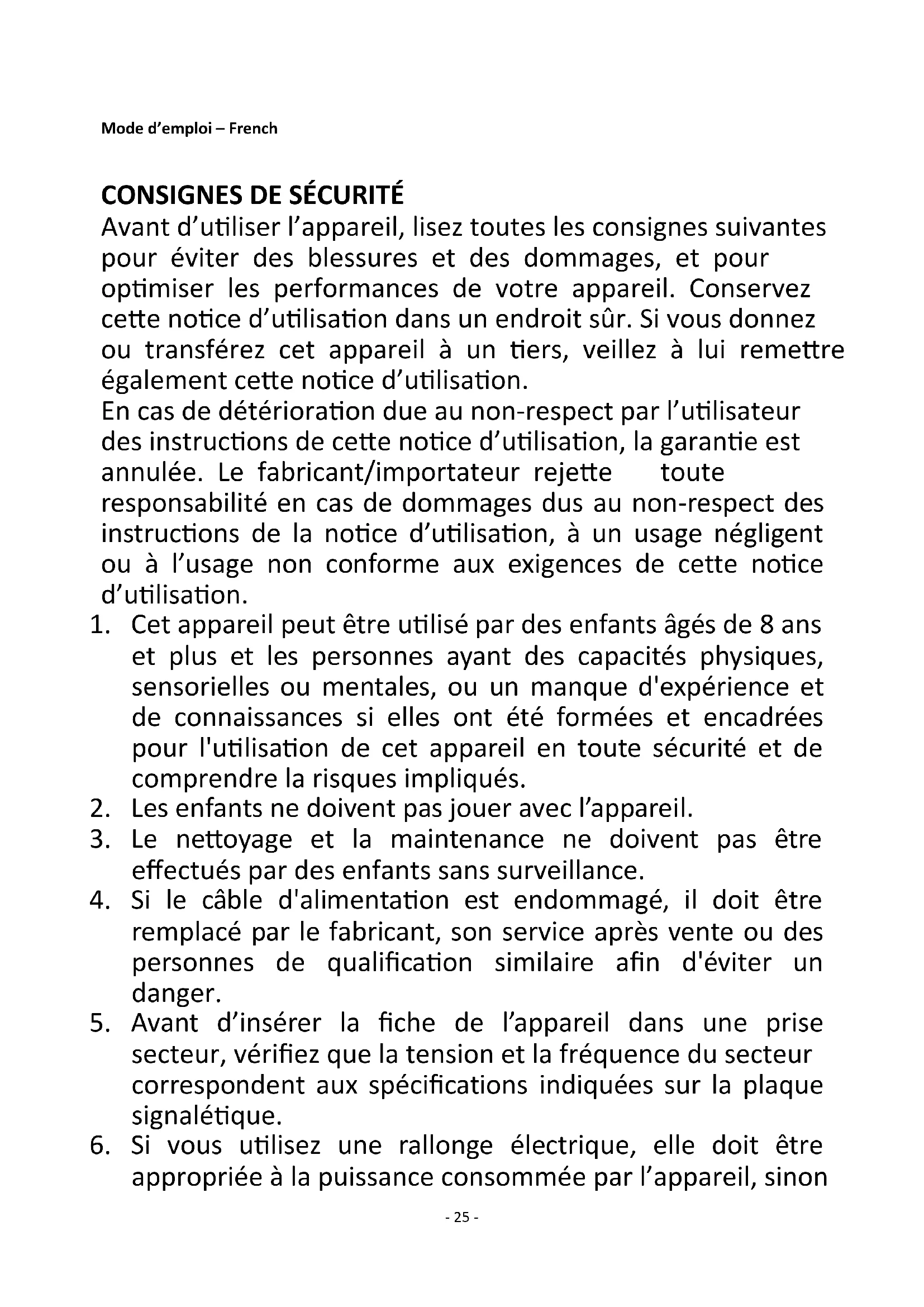 Avant d’utiliser l’appareil, lisez toutes les consignes suivantes pour éviter des blessures et des dommages, et pour optimiser les performances de votre appareil. Conservez cette notice d’utilisation dans un endroit sûr. Si vous donnez ou transférez cet appareil à un tiers, veillez à lui remettre également cette notice d’utilisation. En cas de détérioration due au non-respect par l’utilisateur des instructions de cette notice d’utilisation, la garantie est annulée. Le fabricant/importateur rejette toute responsabilité en cas de dommages dus au non-respect des instructions de la notice d’utilisation, à un usage négligent ou à l’usage non conforme aux exigences de cette notice d’utilisation.