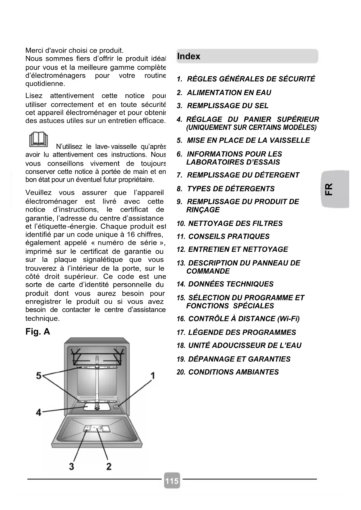 (Fig. A "1") L’apparition de taches blanches sur la vaisselle est généralement un signe qui permet savoir que le sel est manquant. Sur le fond de la machine se trouve le bac à sel pour la régénération de l'adoucisseur d'eau. Il est important de n’utiliser que le sel spécifiquement prévu pour les lavevaisselle