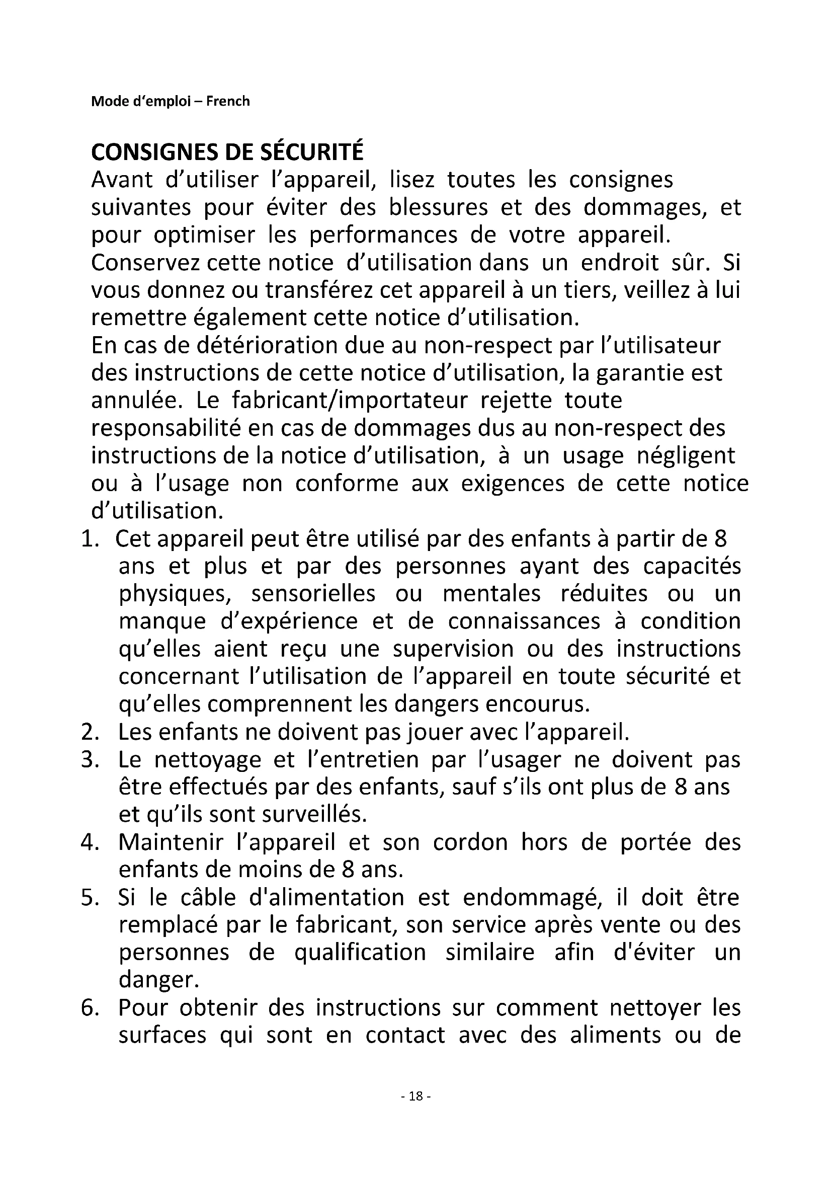 Avant d’utiliser l’appareil, lisez toutes les consignes suivantes pour éviter des blessures et des dommages, et pour optimiser les performances de votre appareil. Conservez cette notice d’utilisation dans un endroit sûr. Si vous donnez ou transférez cet appareil à un tiers, veillez à lui remettre également cette notice d’utilisation. En cas de détérioration due au non-respect par l’utilisateur des instructions de cette notice d’utilisation, la garantie est annulée. Le fabricant/importateur rejette toute responsabilité en cas de dommages dus au non-respect des instructions de la notice d’utilisation, à un usage négligent ou à l’usage non conforme aux exigences de cette notice d’utilisation.