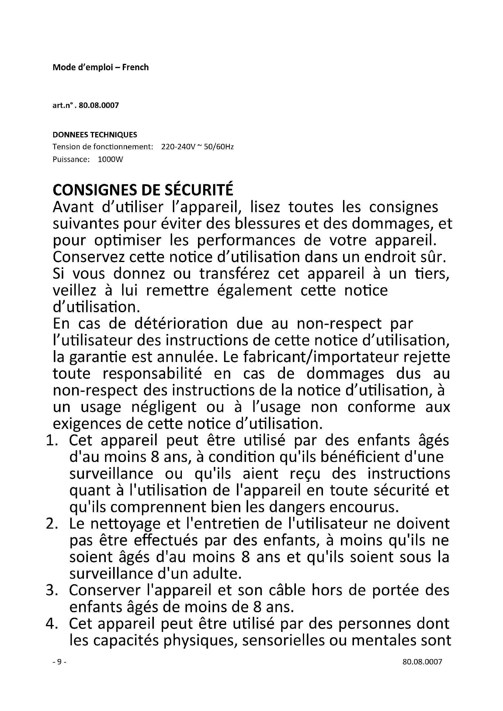 appropriée à la puissance consommée par l’appareil, sinon la rallonge et/ou la fiche risquent de chauffer excessivement. Il existe un risque potentiel de- 11 - 80.08.0007 blessures par trébuchement sur le cordon électrique. Prenez vos précautions pour éviter toute situation dangereuse.