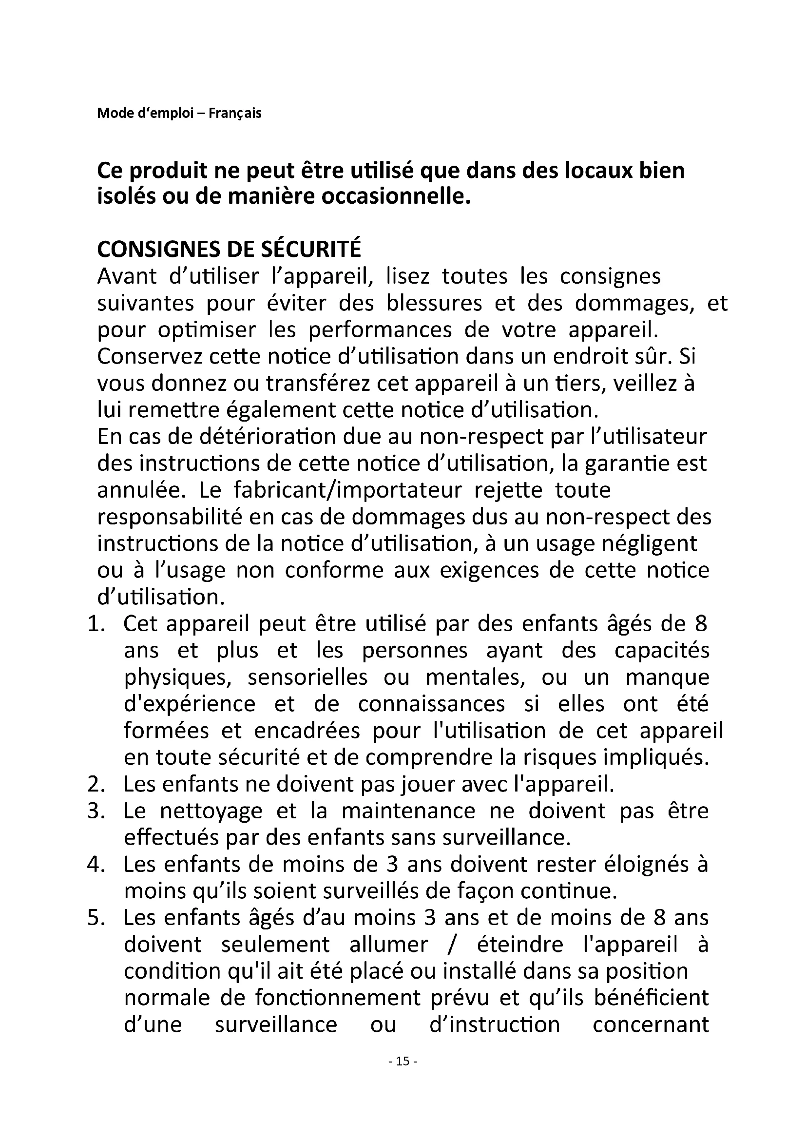 doivent seulement allumer / éteindre l'appareil à condition qu'il ait été placé ou installé dans sa position normale de fonctionnement prévu et qu’ils bénéficient d’une surveillance ou d’instruction concernant- 16 - l'utilisation de l'appareil d'une manière sûre et reconnaissent les risques encourus. Les enfants âgés d’au moins 3 ans et de moins de 8 ans ne doivent pas brancher, régler et nettoyer l'appareil ou d'effectuer l'entretien de l'utilisateur.