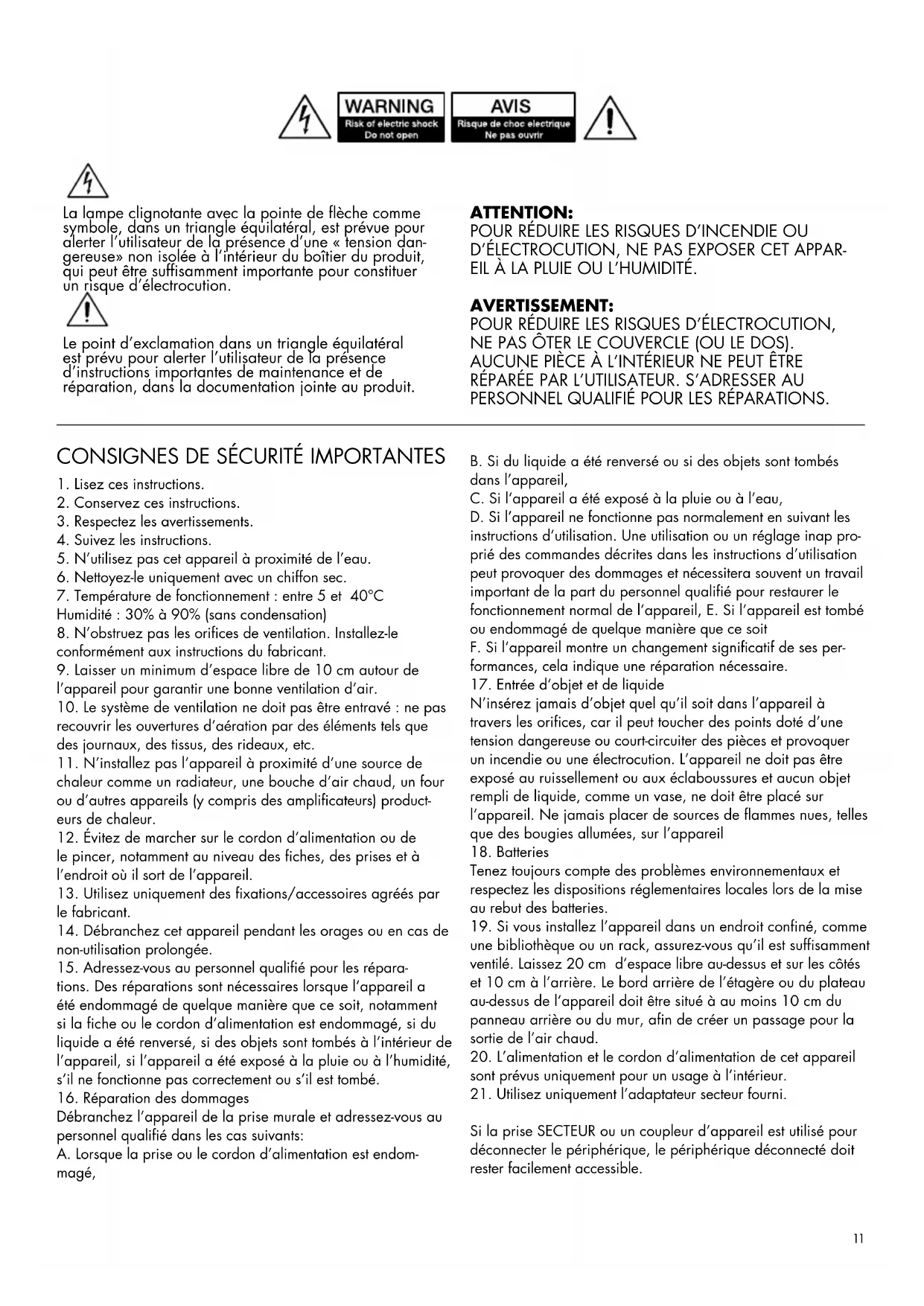 Si la prise SECTEUR ou un coupleur d’appareil est utilisé pour déconnecter le périphérique, le périphérique déconnecté doit rester facilement accessible. Attention: POUR RÉDUIRE LES RISQUES D’INCENDIE OU D’ÉLECTROCUTION, NE PAS EXPOSER CET APPAR- EIL À LA PLUIE OU L’HUMIDITÉ.