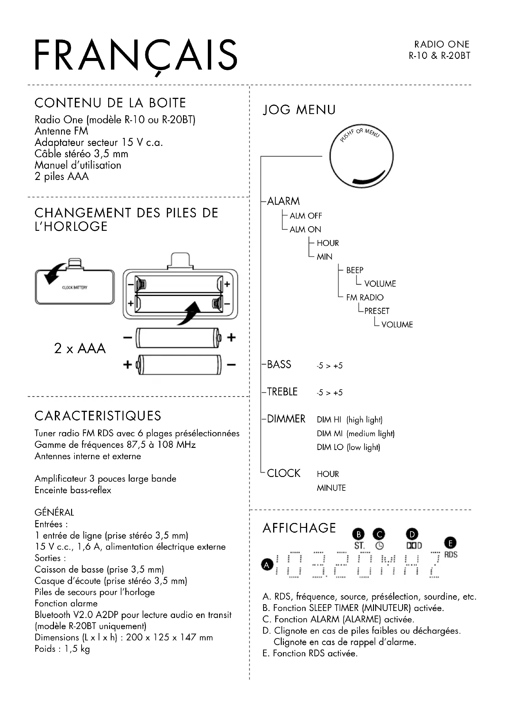Radio One (modèle R-10 ou R-20BT) Antenne FM Adaptateur secteur 15 V c.a. Câble stéréo 3,5 mm Manuel d’utilisation 2 piles AAA JOG MENU AFFICHAGE