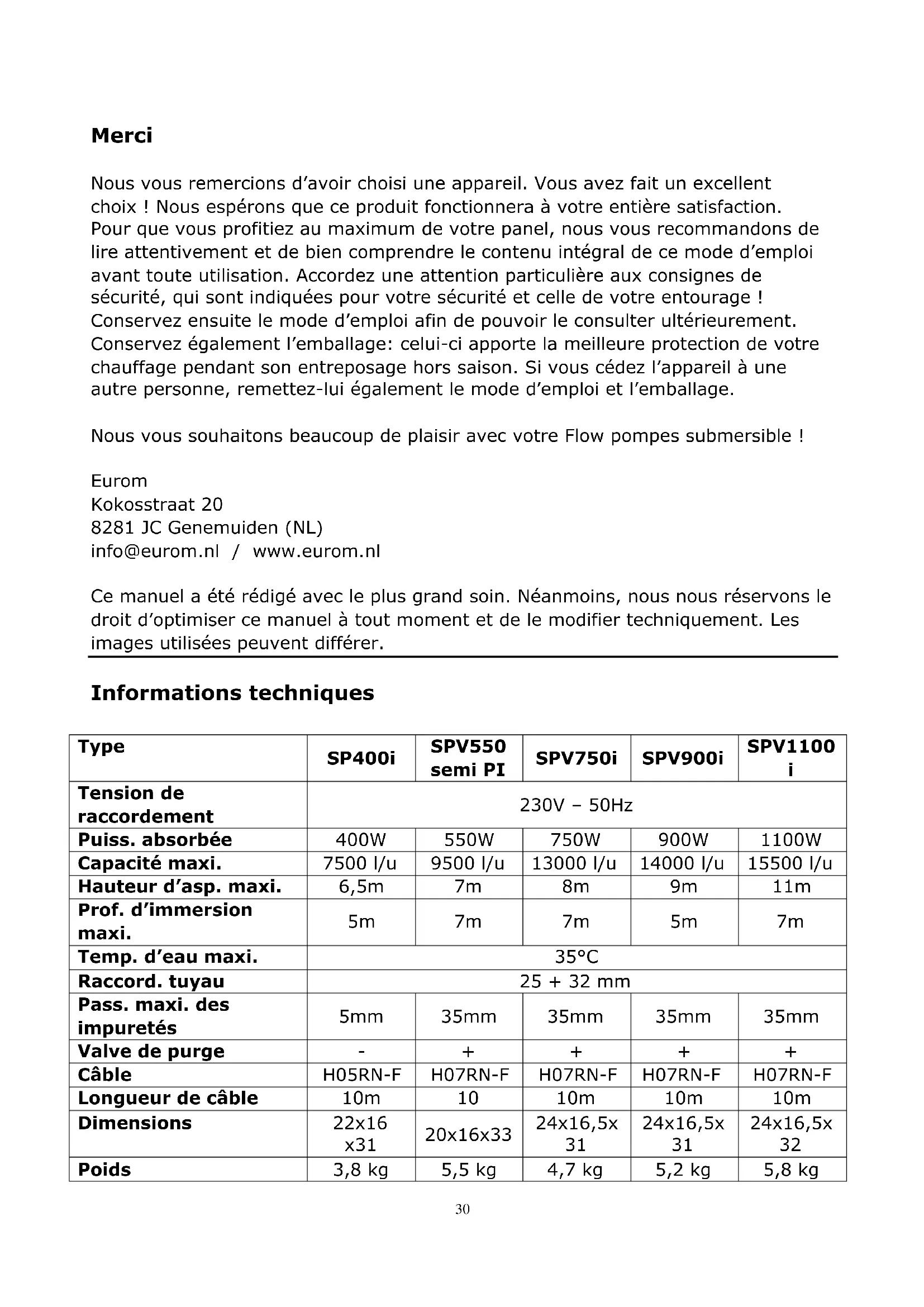 Poids 3,8 kg 5,5 kg 4,7 kg 5,2 kg 5,8 kg31 Consignes de sécurité Avant utilisation, contrôlez votre nouvelle pompe (y compris le cordon et la fiche) quant à la présence de dommages visibles. Ne mettez pas en service une pompe endommagée, mais apportez-la à votre fournisseur en vue d’un remplacement. Pour des raisons de sécurité, la pompe immergée doit toujours être raccordée à une prise à la terre, laquelle doit être installée selon les règlements nationaux, et faire partie d’une installation électrique protégée par fusible d’au maximum 16 Amp et équipée d’un disjoncteur de fuite de terre (courant nominale ≤30 mA). Vérifiez la pompe, le câble électrique, la fiche et la prise avant chaque utilisation. Si vous constatez des dommages, n’utilisez pas la pompe, mais faites-la réparer par un électricien renommé. Assurez-vous que les raccords électriques sont, et restent, au sec à tout moment. Ne les touchez pas avec les mains mouillées Avant utilisation, vérifiez si la prise électrique sur laquelle vous souhaitez raccorder la pompe convient à celle-ci (voir la plaque signalétique). Protégez le câble électrique et la fiche contre la chaleur, l’huile et les objets tranchants. Avant l’utilisation, nettoyez le tuyau d’évacuation. Avant l’utilisation, vérifiez si la hauteur d’aspiration ne dépasse pas la capacité de votre pompe. N’utilisez pas le câble électrique pour suspendre, descendre ou déplacer la pompe. Pour cela, fixez éventuellement une corde à la poignée. Ne tirez pas sur la fiche pour débrancher le câble de la prise, mais saisissez la fiche à la main ! Après avoir pompé de l’eau contenant, par ex. du chlore, ou contenant des corps solides, vous devez rincer la pompe et les tuyaux à l’eau claire. N’oubliez pas que le sable et les substances abrasives et corrosives accélèrent l’usure et influent sur la capacité de la pompe. Évitez de faire fonctionner la pompe si, pour quelque raison que ce soit, elle ne peut évacuer l’eau : évacuation bouchée, hauteur de refoulement trop élevée, etc. Cela endommage la pompe ! N’utilisez pas la pompe lorsque des personnes se trouvent dans l’objet à vider. Il est formellement interdit d’utiliser cette pompe dans une piscine.32 Le fonctionnement à vide accélère l’usure et cause une surchauffe de la pompe. Évitez donc à tout moment de faire fonctionner la pompe s’il n’y a plus d’eau. Arrêtez-la immédiatement dès que cela arrive. Avant toute vérification ou nettoyage de la pompe, vous devez l’arrêter par débrancher de la prise électrique. Pour éviter tout risque de blessure, n’introduisez en aucun cas les doigts dans l’ouverture d’aspiration de la pompe si celle-ci est sous tension. Exercez une surveillance étroite lorsque cet appareil est utilisé en présence d'enfants, de personnes incompétentes ou d’animaux domestiques. Cet appareil ne convient pas à une utilisation par des personnes (y compris des enfants) souffrant d'un handicap physique, sensoriel ou mental ou manquant d'expérience ou de connaissance, même si une surveillance est assurée ou que des instructions ont été données sur l'utilisation de l'appareil par une personne responsable de leur sécurité Tenez l’appareil hors de portée d’enfants et ne les laissez jamais seuls avec l’appareil. Lorsque vous choisissez l’endroit où l’appareil sera placé, tenez compte du fait que cet endroit doit rester inaccessible à des enfants. Assurez-vous qu’ils ne jouent pas avec l’appareil. Ne réparez jamais la pompe, le câble et/ou la fiche vous-même, mais confiez-la à un professionnel. L’importateur et le fabricant n’acceptent aucune responsabilité pour des réparations effectuées par une personne incompétente, ni en cas de modifications à la pompe. De telles interventions annulent également la garantie. Pour quel usage est conçue la pompe ? Cette pompe immergée a été conçue pour un usage privé dans et autour de la maison et du jardin. Les pompes immergées sont utilisées principalement pour évacuer de l’eau, pour le transvasement de l’eau, pour vider des réservoirs d’eau, des caves, etc., le pompage d’eau dans des sources et puits, le vidage de bateaux et de yachts, ainsi que pour la circulation temporaire d’eau. Attention : ces pompes ne doivent pas être utilisées dans une piscine ! Les pompes sont entièrement étanches et peuvent être immergées dans un liquide jusqu’à une profondeur maximum de 5 ou 7 mètres (voir les informations techniques).33 La pompe immergée convient aux liquides suivants: Type Spi: eau claire et eau savonneuse. Type SPV et SPVi: eaux claires et légèrement sales et eau savonneuse. Il est interdit de pomper des liquides corrosifs, légèrement inflammables ou explosifs (comme l’essence, le diesel, le pétrole, les solvants, etc.), des graisses, huiles, des eaux salées ou usées provenant des toilettes etc. ! N’oubliez pas que le sable et les substances abrasives et corrosives accélèrent l’usure et influent sur la capacité de la pompe. La température du liquide à pomper ne doit pas dépasser 35°C. Cette pompe ne convient pas à un usage permanent, comme la circulation permanente d’eau. Ce type d’utilisation réduira considérablement la durée de vie de la pompe. Description (le modèle peut varier légèrement)