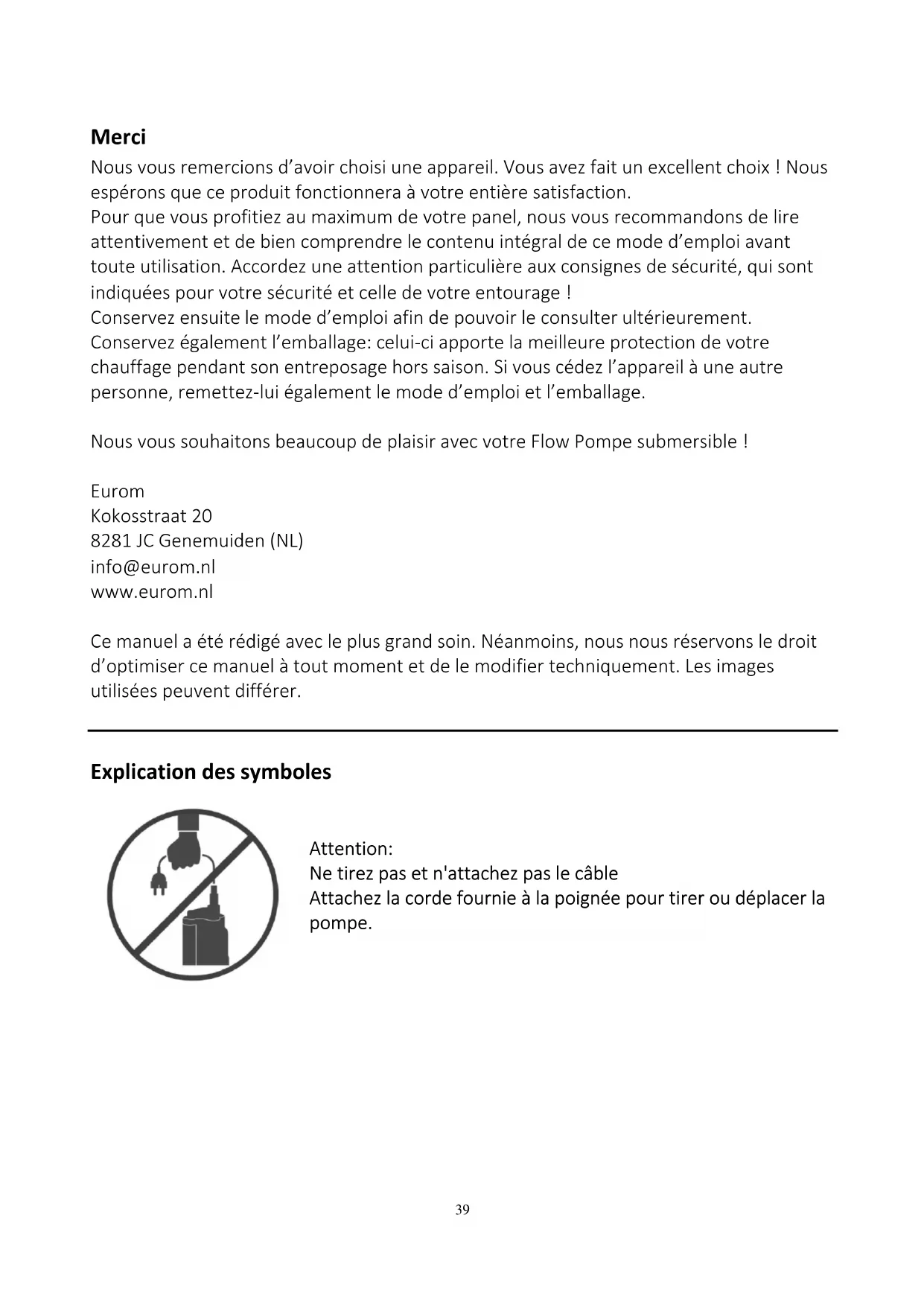 Merci Nous vous remercions d’avoir choisi une appareil. Vous avez fait un excellent choix ! Nous espérons que ce produit fonctionnera à votre entière satisfaction. Pour que vous profitiez au maximum de votre panel, nous vous recommandons de lire attentivement et de bien comprendre le contenu intégral de ce mode d’emploi avant toute utilisation. Accordez une attention particulière aux consignes de sécurité, qui sont indiquées pour votre sécurité et celle de votre entourage ! Conservez ensuite le mode d’emploi afin de pouvoir le consulter ultérieurement. Conservez également l’emballage: celui-ci apporte la meilleure protection de votre chauffage pendant son entreposage hors saison. Si vous cédez l’appareil à une autre personne, remettez-lui également le mode d’emploi et l’emballage. Nous vous souhaitons beaucoup de plaisir avec votre Flow Pompe submersible ! Eurom Kokosstraat 20 8281 JC Genemuiden (NL) info@eurom.nl www.eurom.nl Ce manuel a été rédigé avec le plus grand soin. Néanmoins, nous nous réservons le droit d’optimiser ce manuel à tout moment et de le modifier techniquement. Les images utilisées peuvent différer.