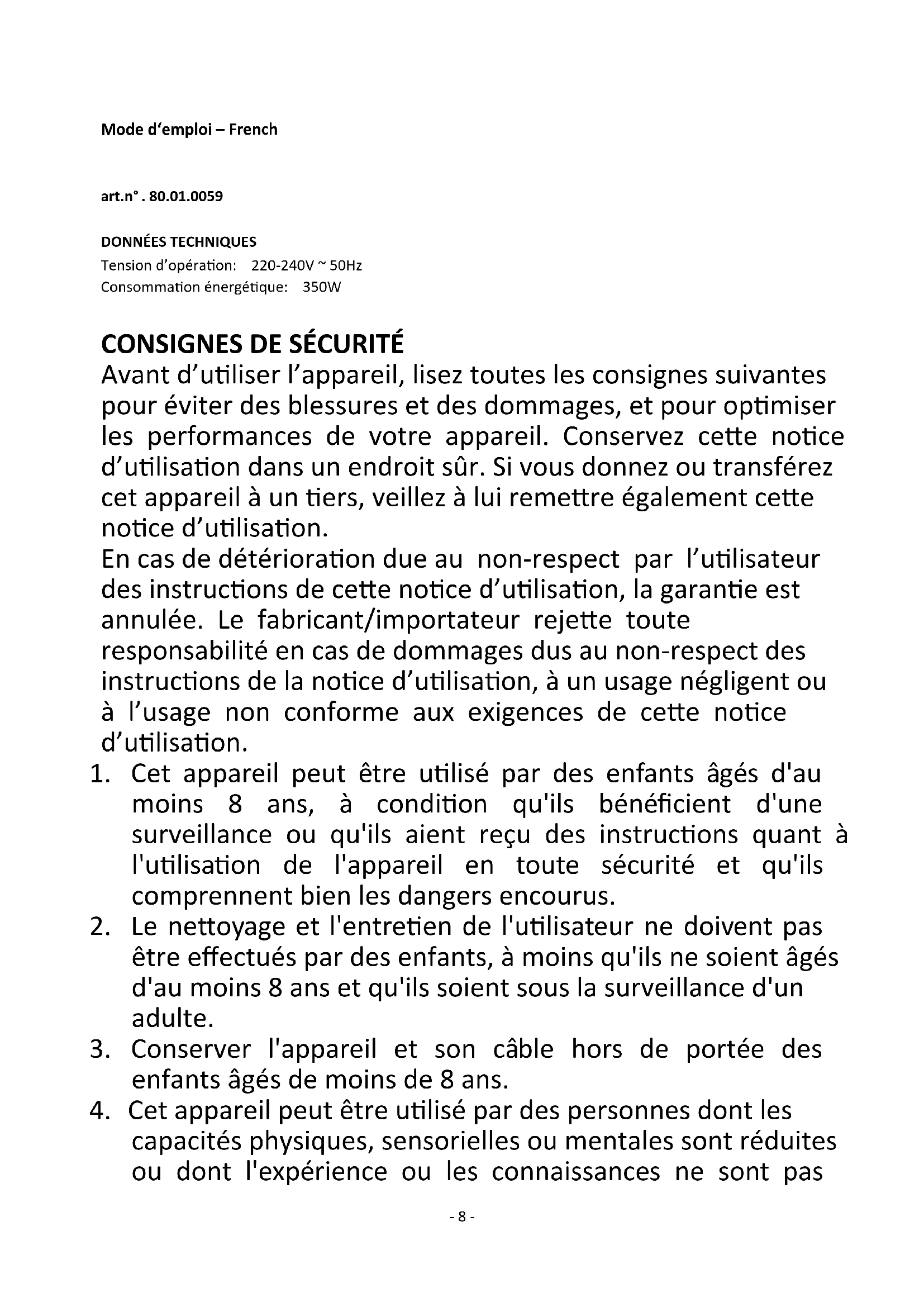 Qualité HEMA attache une grande importance à la sécurité et à la qualité. Nous disposons de notre propre laboratoire. Ce laboratoire évalue la sécurité électrique et les propriétés d’utilisation de tous les appareils avant leur insertion dans l’assortiment. En outre, HEMA contrôle la qualité du produit en collaboration avec le fabricant. Sécurité Il est possible que cet article HEMA soit pourvu d’une bande de protection en plastique. Cette bande se trouve en dessous de l’appareil. Elle n’a aucune influence sur la qualité ou le fonctionnement de l'article et peut être enlevée sans problème. Réparation Si une réparation est nécessaire, vous pouvez rapporter l’appareil, bien emballé, dans un magasin HEMA. S’il est toujours sous garantie, il doit être accompagné du bon de garantie et du bon d’achat. Vous pouvez porter votre appareil à réparer dans tous les magasins HEMA. Vérifiez régulièrement si le cordon n’est pas abîmé. Lorsque le cordon est abîmé, faites réparer l’appareil dans un magasin Hema. Ne pas remplacer le cordon soi-même. Pour des raisons de sécurité, il est conseillé de ne pas réparer soi-même des appareils électriques. Conditions de garantie Nous vous garantissons la qualité Hema B.V. offre une garantie totale sur l'article mentionné sur le bon de garantie en cas de défauts occasionnés par des vices de fabrication ou de matériel. Pour tous les appareils ménagers électriques, le délai de garantie est de 2 ans après la date d'achat. La garantie est annulée dans le cas suivants : a. le défaut est causé par une utilisation incompétente ou abusive, par négligence, par un mauvais branchement ou suite à une chute ou un choc ; b. vous avez tenté, durant la période de garantie, de réparer vous-même l'article ou de le faire réparer par un réparateur autre que HEMA . Si vous voulez et pouvez faire usage de la garantie L'article, accompagné du ticket de caisse, doit être apporté en réparation dans l'un de nos magasins. En règle générale la réparation est effectuée dans un délai de 15 jours - sauf en cas de circonstances exceptionnelles - et entièrement gratuitement. Une sécurité supplémentaire pour être sûr de votre choix Si toutefois vous n'étiez pas satisfait de l'article (par exemple, si le modèle ne vous plaît pas ou que vous avez fait un achat double), vous pouvez ramener l'article intact et dans son emballage d'origine dans les 30 jours qui- 13 - suivent son achat. N'oubliez pas le ticket de caisse. Vous pouvez échanger l'article ou, si vous le souhaitez, être remboursé. Ces conditions de garantie s'appliquent dans tous les pays où HEMA possède des magasins. 1er novembre 2010 Hema B.V. Postbus 37110 1030 AC Amsterdam Pays-Bas Ces conditions de garantie sont valables sans préjudice des droits légaux du client ou des actions intentées par lui.- 14 - Instruction manual – English art.no. 80.01.0059 TECHNICAL DATA Operating voltage: 220-240V ~ 50Hz Power consumption: 350W SAFETY INSTRUCTIONS Before use make sure to read all of the below instructions in order to avoid injury or damage, and to get the best results from the appliance. Make sure to keep this manual in a safe place. If you give or transfer this appliance to someone else make sure to also include this manual. In case of damage caused by user failing to follow the instructions in this manual the warranty will be void. The manufacturer/importer accepts no liability for damages caused by failure to follow the manual, a negligent use or use not in accordance with the requirements of this manual.