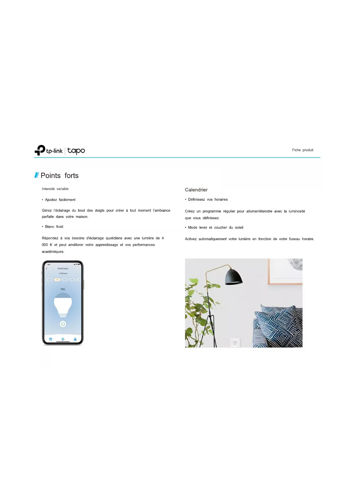 - Ajustezfacilement Créezunprogrammerégulierpourallumer/éteindreaveclaluminosité quevousdéfinissez.Vouspouvezutiliserdesassistantsvocauxpourcontrôlervos appareilsavecdescommandesvocalestellesque«Alexa,allumela lumières'ilteplaît». Libérezvosmainsgrâceàlacommandevocale Unmoyendedissuasionpourvotremaison LemodeAbsent,unefonctionquisimuleintelligemmentlaprésenced'une personneàlamaisonenallumantetéteignantlalumière,donnel'impression quequelqu'unestàlamaisonlorsquevouseffectuezdelongsvoyagesafin d'éloignerlespersonnesmalintentionnées. Ficheproduit Pointsforts·Commande à distance –Allumez/éteignezinstantanémentlalumièreoù quevoussoyezgrâceàl'applicationTapo électroniqueconnectée