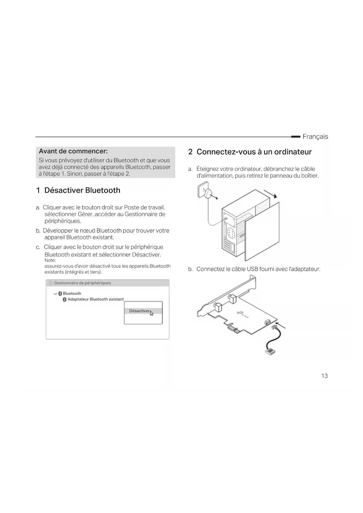 Βεβαιωθείτε ότι το Bluetooth της συσκευής σας είναι ενεργό και ανιχνεύσιμο.13 Français 2 Connectez-vous à un ordinateur a. Éteignez votre ordinateur, débranchez le câble d'alimentation, puis retirez le panneau du boîtier. b. Connectez le câble USB fourni avec l'adaptateur. 1 Désactiver Bluetooth a. Cliquer avec le bouton droit sur Poste de travail, sélectionner Gérer, accéder au Gestionnaire de périphériques. b. Développer le nœud Bluetooth pour trouver votre appareil Bluetooth existant. c. Cliquer avec le bouton droit sur le périphérique Bluetooth existant et sélectionner Désactiver. Note: assurez-vous d'avoir désactivé tous les appareils Bluetooth existants (intégrés et tiers). Bluetooth Gestionnaire de périphériques Désactiver Adaptateur Bluetooth existant Avant de commencer: Si vous prévoyez d'utiliser du Bluetooth et que vous avez déjà connecté des appareils Bluetooth, passer à l'étape 1. Sinon, passer à l'étape 2.Français