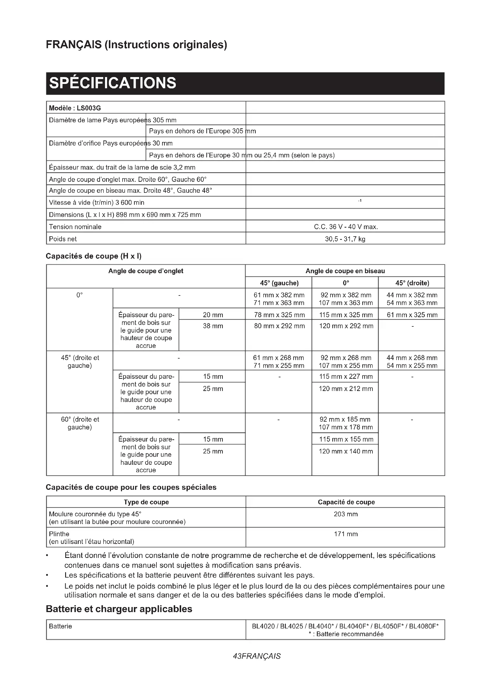 - Makita genuine battery and charger NOTE: Some items in the list may be included in the tool package as standard accessories. They may dier from country to country.43 FRANÇAIS FRANÇAIS (Instructions originales) SPÉCIFICATIONS Modèle : LS003G Diamètre de lame Pays européens 305 mm Pays en dehors de l’Europe 305 mm Diamètre d’orice Pays européens 30 mm Pays en dehors de l’Europe 30 mm ou 25,4 mm (selon le pays) Épaisseur max. du trait de la lame de scie 3,2 mm Angle de coupe d’onglet max. Droite 60°, Gauche 60° Angle de coupe en biseau max. Droite 48°, Gauche 48° Vitesse à vide (tr/min) 3 600 min