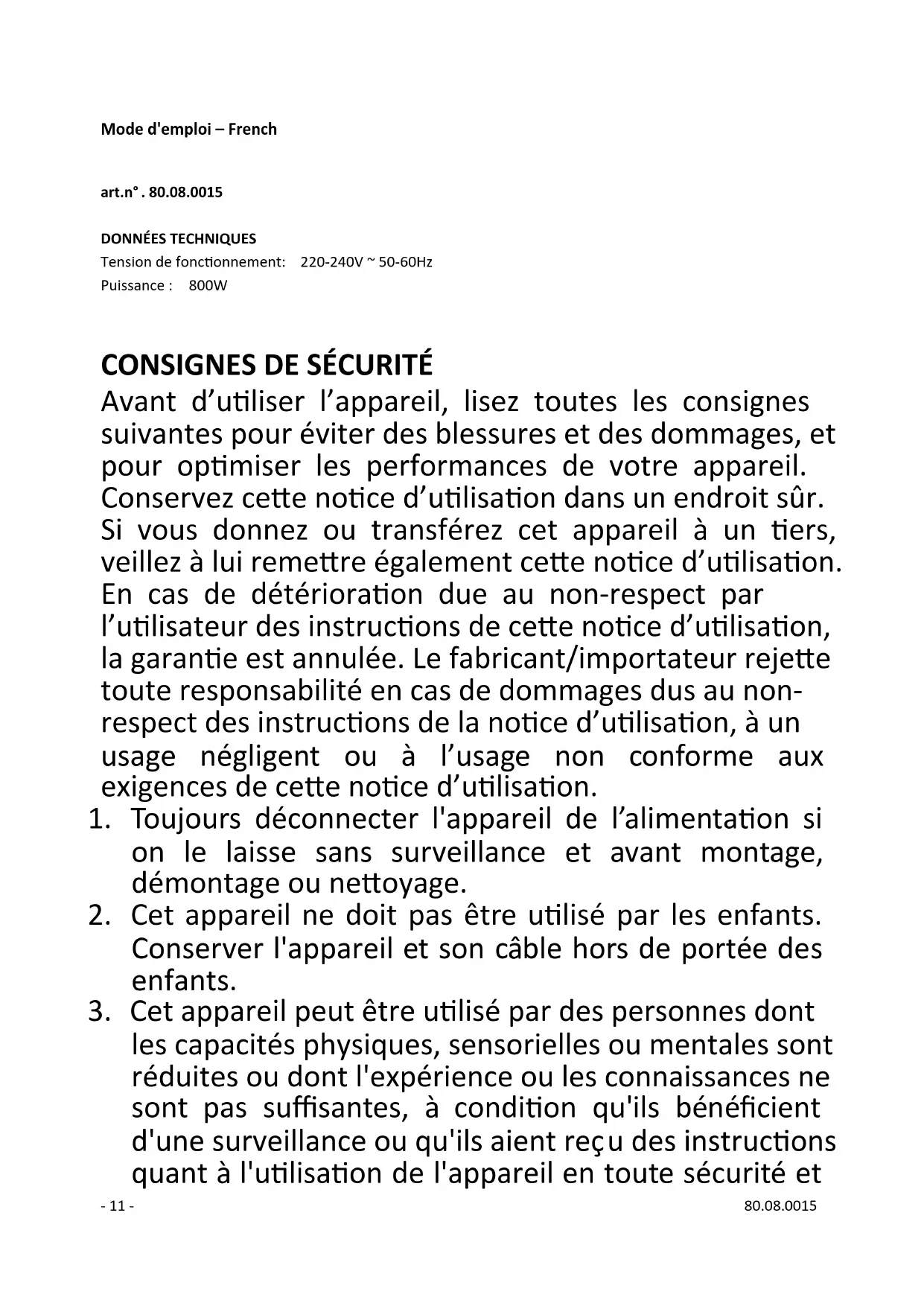 Avant d’utiliser l’appareil, lisez toutes les consignes suivantes pour éviter des blessures et des dommages, et pour optimiser les performances de votre appareil. Conservez cette notice d’utilisation dans un endroit sûr. Si vous donnez ou transférez cet appareil à un tiers, veillez à lui remettre également cette notice d’utilisation. En cas de détérioration due au non-respect par l’utilisateur des instructions de cette notice d’utilisation, la garantie est annulée. Le fabricant/importateur rejette toute responsabilité en cas de dommages dus au non- respect des instructions de la notice d’utilisation, à un usage négligent ou à l’usage non conforme aux exigences de cette notice d’utilisation.