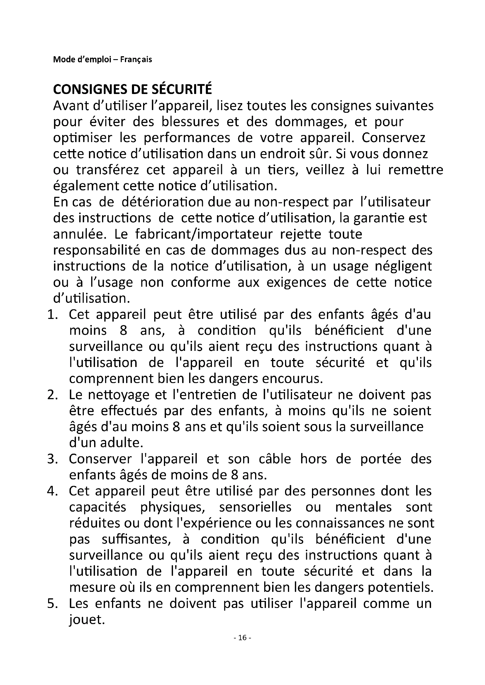 Avant d’utiliser l’appareil, lisez toutes les consignes suivantes pour éviter des blessures et des dommages, et pour optimiser les performances de votre appareil. Conservez cette notice d’utilisation dans un endroit sûr. Si vous donnez ou transférez cet appareil à un tiers, veillez à lui remettre également cette notice d’utilisation. En cas de détérioration due au non-respect par l’utilisateur des instructions de cette notice d’utilisation, la garantie est annulée. Le fabricant/importateur rejette toute responsabilité en cas de dommages dus au non-respect des instructions de la notice d’utilisation, à un usage négligent ou à l’usage non conforme aux exigences de cette notice d’utilisation.