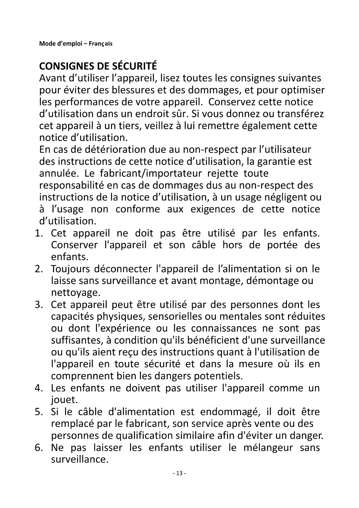 Avant d’utiliser l’appareil, lisez toutes les consignes suivantes pour éviter des blessures et des dommages, et pour optimiser les performances de votre appareil. Conservez cette notice d’utilisation dans un endroit sûr. Si vous donnez ou transférez cet appareil à un tiers, veillez à lui remettre également cette notice d’utilisation. En cas de détérioration due au non-respect par l’utilisateur des instructions de cette notice d’utilisation, la garantie est annulée. Le fabricant/importateur rejette toute responsabilité en cas de dommages dus au non-respect des instructions de la notice d’utilisation, à un usage négligent ou à l’usage non conforme aux exigences de cette notice d’utilisation.