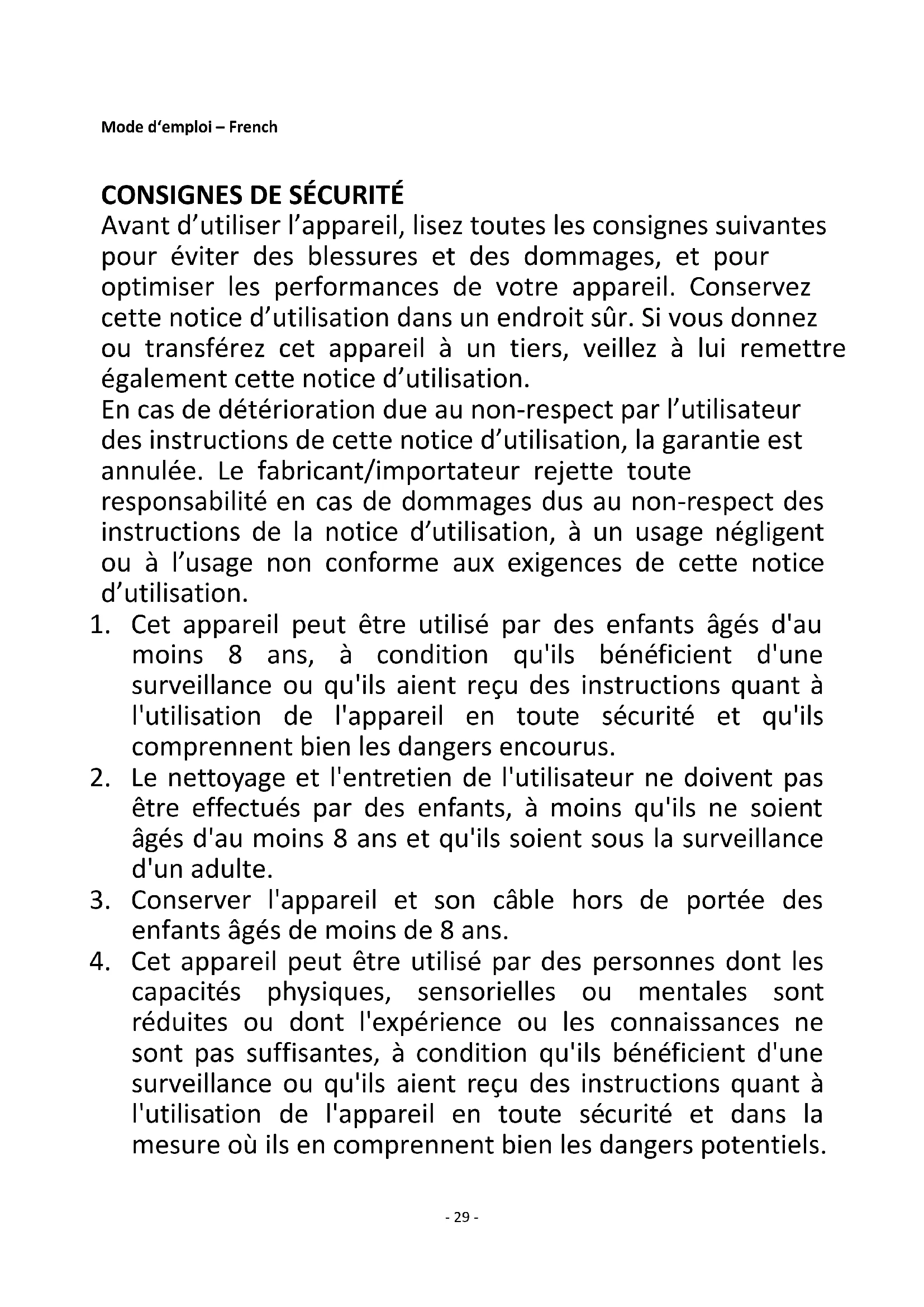 Avant d’utiliser l’appareil, lisez toutes les consignes suivantes pour éviter des blessures et des dommages, et pour optimiser les performances de votre appareil. Conservez cette notice d’utilisation dans un endroit sûr. Si vous donnez ou transférez cet appareil à un tiers, veillez à lui remettre également cette notice d’utilisation. En cas de détérioration due au non-respect par l’utilisateur des instructions de cette notice d’utilisation, la garantie est annulée. Le fabricant/importateur rejette toute responsabilité en cas de dommages dus au non-respect des instructions de la notice d’utilisation, à un usage négligent ou à l’usage non conforme aux exigences de cette notice d’utilisation.