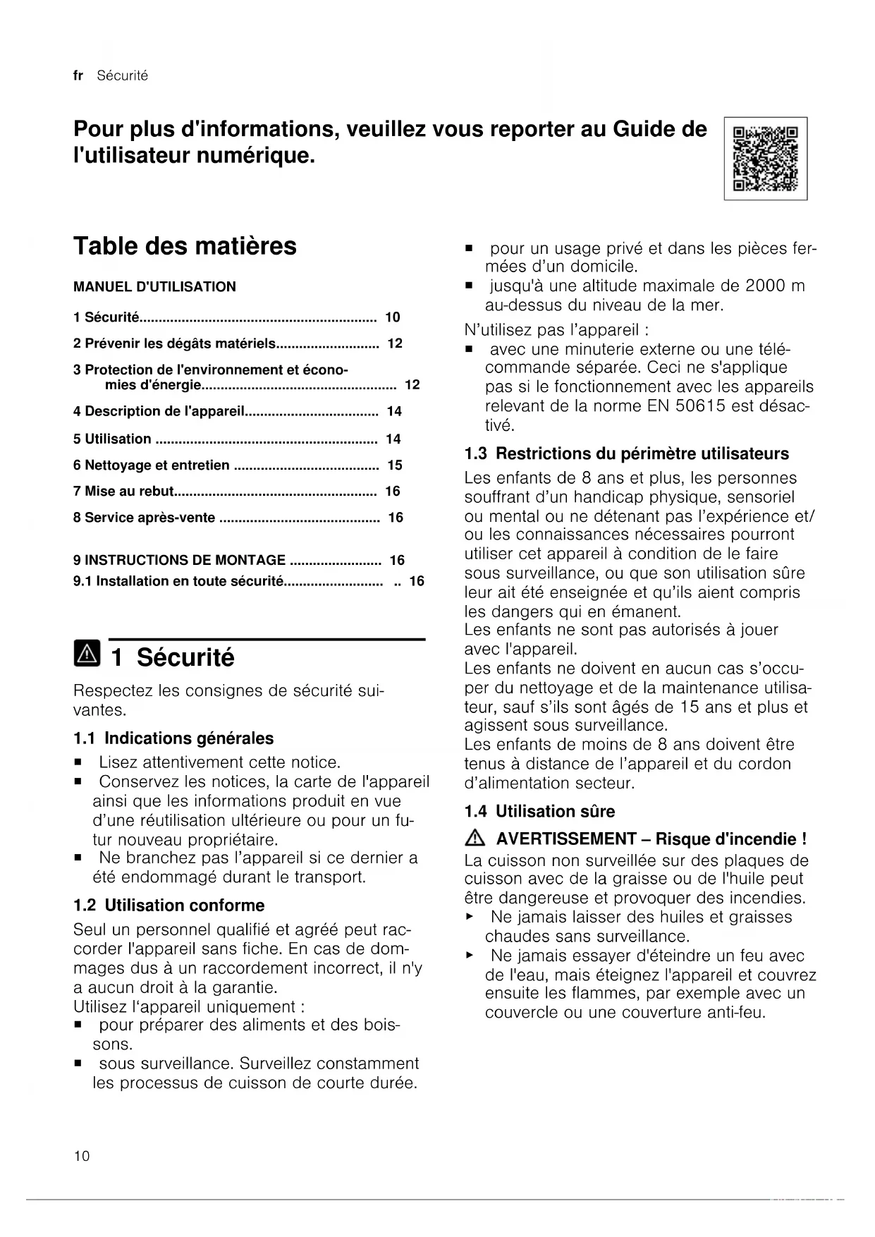 1 Sécurité Respectez les consignes de sécurité sui- vantes. 1.1 Indications générales ¡ Lisez attentivement cette notice. ¡ Conservez les notices, la carte de l'appareil ainsi que les informations produit en vue d’une réutilisation ultérieure ou pour un fu- tur nouveau propriétaire. ¡ Ne branchez pas l’appareil si ce dernier a été endommagé durant le transport. 1.2 Utilisation conforme Seul un personnel qualifié et agréé peut rac- corder l'appareil sans fiche. En cas de dom- mages dus à un raccordement incorrect, il n'y a aucun droit à la garantie. Utilisez l‘appareil uniquement: ¡ pour préparer des aliments et des bois- sons. ¡ sous surveillance. Surveillez constamment les processus de cuisson de courte durée. ¡ pour un usage privé et dans les pièces fer- mées d’un domicile. ¡ jusqu'à une altitude maximale de 2000m au-dessus du niveau de la mer. N’utilisez pas l’appareil: ¡ avec une minuterie externe ou une télé- commande séparée. Ceci ne s'applique pas si le fonctionnement avec les appareils relevant de la norme EN 50615 est désac- tivé. 1.3 Restrictions du périmètre utilisateurs Les enfants de 8 ans et plus, les personnes souffrant d’un handicap physique, sensoriel ou mental ou ne détenant pas l’expérience et/ ou les connaissances nécessaires pourront utiliser cet appareil à condition de le faire sous surveillance, ou que son utilisation sûre leur ait été enseignée et qu’ils aient compris les dangers qui en émanent. Les enfants ne sont pas autorisés à jouer avec l'appareil. Les enfants ne doivent en aucun cas s’occu- per du nettoyage et de la maintenance utilisa- teur, sauf s’ils sont âgés de 15ans et plus et agissent sous surveillance. Les enfants de moins de 8ans doivent être tenus à distance de l’appareil et du cordon d’alimentation secteur. 1.4 Utilisation sûre AVERTISSEMENT‒Risque d'incendie! La cuisson non surveillée sur des plaques de cuisson avec de la graisse ou de l'huile peut être dangereuse et provoquer des incendies. ▶ Ne jamais laisser des huiles et graisses chaudes sans surveillance. ▶ Ne jamais essayer d'éteindre un feu avec de l'eau, mais éteignez l'appareil et couvrez ensuite les flammes, par exemple avec un couvercle ou une couverture anti-feu.Sécurité fr