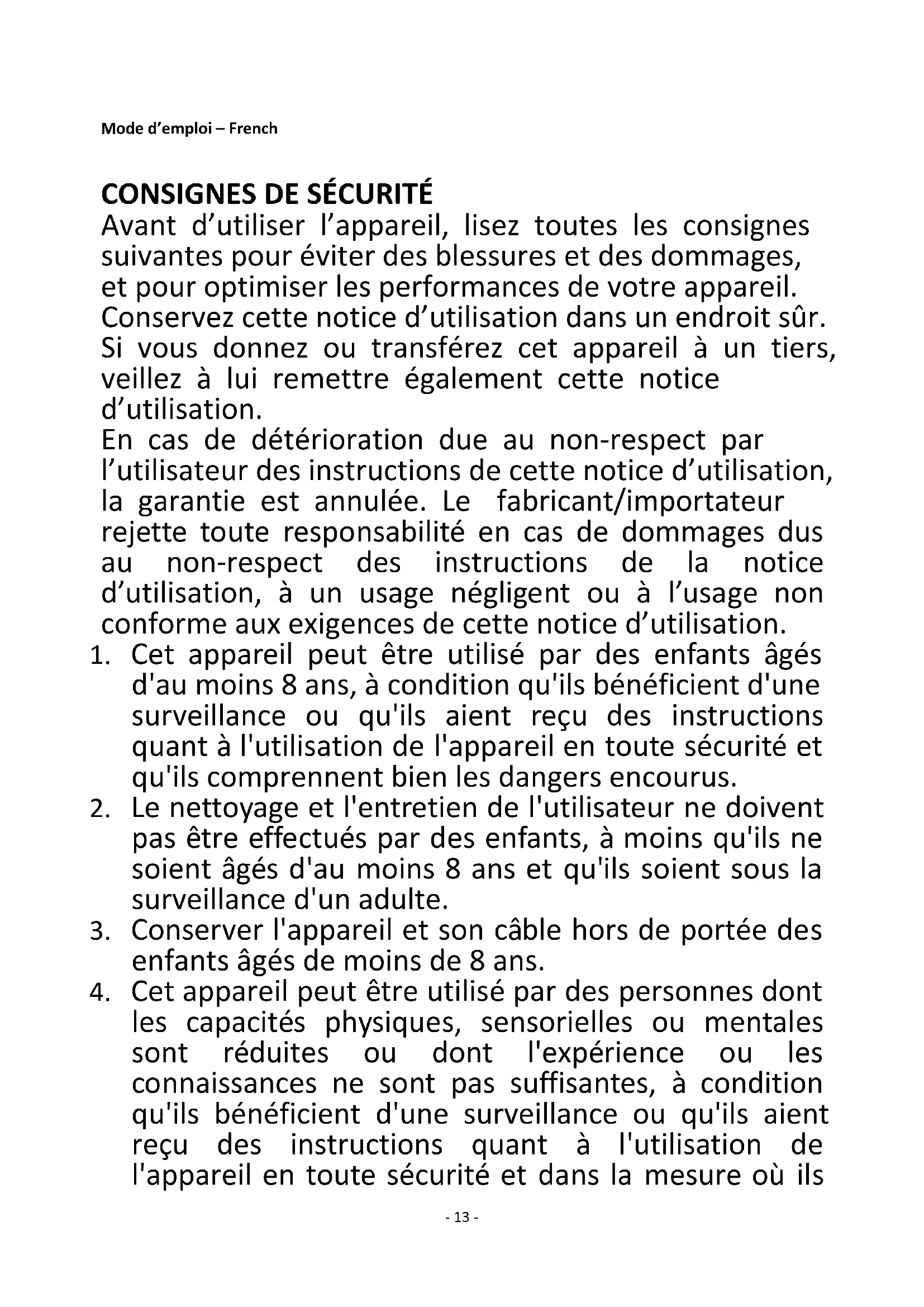 Avant d’utiliser l’appareil, lisez toutes les consignes suivantes pour éviter des blessures et des dommages, et pour optimiser les performances de votre appareil. Conservez cette notice d’utilisation dans un endroit sûr. Si vous donnez ou transférez cet appareil à un tiers, veillez à lui remettre également cette notice d’utilisation. En cas de détérioration due au non-respect par l’utilisateur des instructions de cette notice d’utilisation, la garantie est annulée. Le fabricant/importateur rejette toute responsabilité en cas de dommages dus au non-respect des instructions de la notice d’utilisation, à un usage négligent ou à l’usage non conforme aux exigences de cette notice d’utilisation.