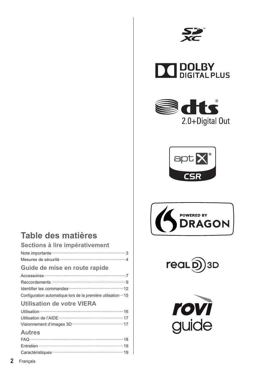 Français Note importante Note pour les fonctions DVB / Diffusion de données / IPTV Pour les informations relatives aux marques de commerce, reportez-vous à [AIDE] (Assistance > Licence). Ce téléviseur est conçu pour respecter les normes (en date du mois d’août 2013) des services numériques terrestres DVB-T / T2 (MPEG2 et MPEG4-AVC(H.264)), des services numériques par câble DVB-C (MPEG2 et MPEG4-AVC(H.264)). Veuillez consulter votre revendeur local pour la disponibilité des services DVB-T / T2 dans votre région. Consultez votre prestataire de services câblés pour la disponibilité des services DVB-C avec ce téléviseur. Ce téléviseur peut ne pas fonctionner correctement avec un signal qui ne correspond pas aux normes DVB-T / T2 ou DVB-C. Toutes les fonctionnalités ne sont pas disponibles en fonction du pays, de la région, du fournisseur de service et de l’environnement du réseau. Tous les modules IC ne fonctionnent pas correctement avec ce téléviseur. Veuillez consulter votre prestataire de services à propos des modules IC disponibles. Il est possible que ce téléviseur ne fonctionne pas correctement avec un module IC non homologué par le prestataire de services. Des frais supplémentaires peuvent être facturés selon le prestataire de services. La compatibilité avec les futurs services n’est pas garantie. Vérifiez les dernières informations concernant les services disponibles sur le site Web suivant. (uniquement en anglais) http://panasonic.net/viera/support Panasonic ne garantit pas l’opération et les performances de périphériques d’autres fabricants ; et nous déclinons toutes responsabilités en cas de dommages en matière de fonctionnement et/ ou de performances résultant de l’utilisation de ces périphériques d’autres fabricants. L’enregistrement et la lecture de contenu sur cet appareil ou sur tout autre appareil peut nécessiter l’autorisation du propriétaire des droits d’auteur ou d’autres droits de cette nature liés à ce contenu. Panasonic n’a aucune autorité quant à cette permission, ne peut vous l’octroyer et décline explicitement tout droit, compétence ou intention d’obtenir une telle permission en votre faveur. Il est de votre responsabilité de vous assurer que l’utilisation de cet appareil ou de tout autre appareil est conforme avec la législation en vigueur sur les droits d’auteur dans votre pays. Veuillez consulter cette législation pour obtenir de plus amples informations sur les lois concernées et les réglementations impliquées ou contactez le propriétaire des droits d’auteur du contenu que vous souhaitez enregistrer ou lire. Français