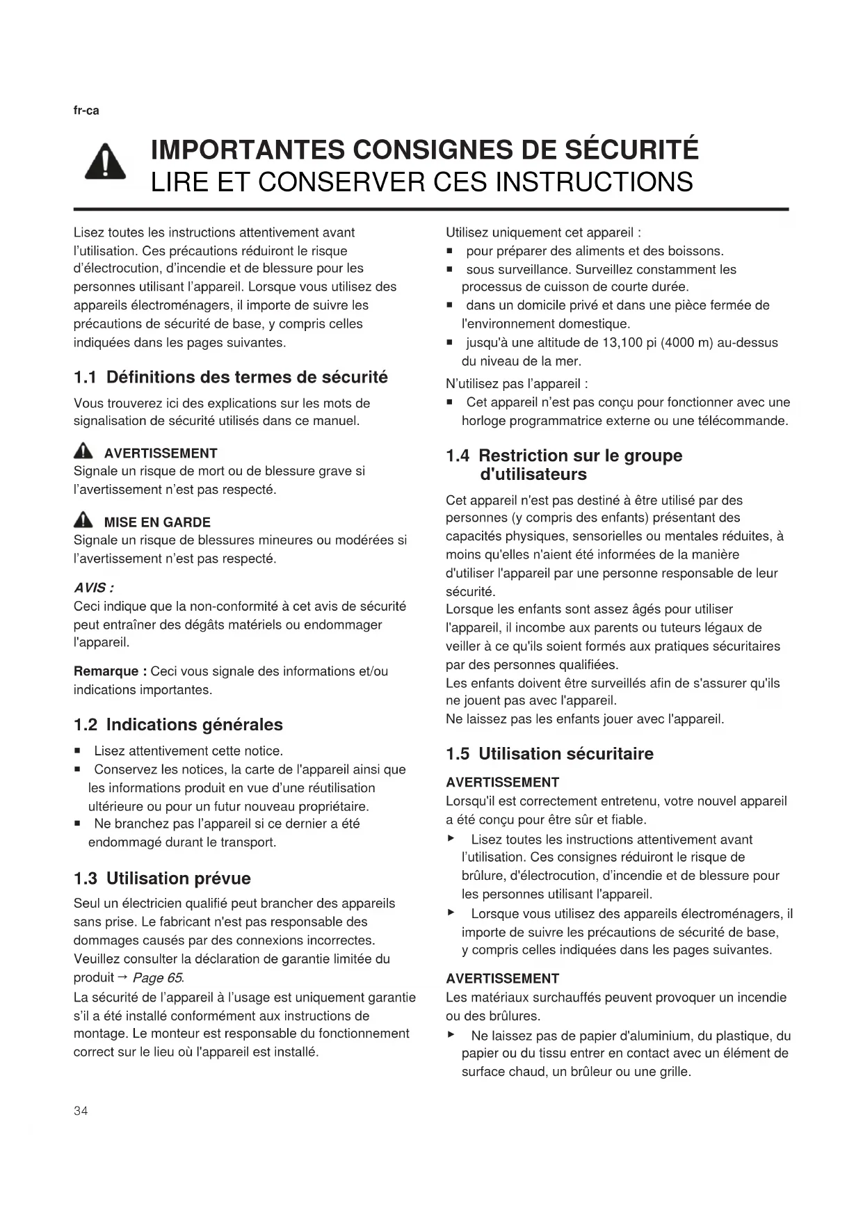 La sécurité de l’appareil à l’usage est uniquement garantie s’il a été installé conformément aux instructions de montage. Le monteur est responsable du fonctionnement correct sur le lieu où l'appareil est installé. Utilisez uniquement cet appareil: ¡ pour préparer des aliments et des boissons. ¡ sous surveillance. Surveillez constamment les processus de cuisson de courte durée. ¡ dans un domicile privé et dans une pièce fermée de l'environnement domestique. ¡ jusqu'à une altitude de 13,100pi (4000m) au-dessus du niveau de la mer. N’utilisez pas l’appareil: ¡ Cet appareil n’est pas conçu pour fonctionner avec une horloge programmatrice externe ou une télécommande. 1.4 Restriction sur le groupe d'utilisateurs Cet appareil n'est pas destiné à être utilisé par des personnes (y compris des enfants) présentant des capacités physiques, sensorielles ou mentales réduites, à moins qu'elles n'aient été informées de la manière d'utiliser l'appareil par une personne responsable de leur sécurité. Lorsque les enfants sont assez âgés pour utiliser l'appareil, il incombe aux parents ou tuteurs légaux de veiller à ce qu'ils soient formés aux pratiques sécuritaires par des personnes qualifiées. Les enfants doivent être surveillés afin de s'assurer qu'ils ne jouent pas avec l'appareil. Ne laissez pas les enfants jouer avec l'appareil. 1.5 Utilisation sécuritaire AVERTISSEMENT Lorsqu'il est correctement entretenu, votre nouvel appareil a été conçu pour être sûr et fiable. ▶ Lisez toutes les instructions attentivement avant l’utilisation. Ces consignes réduiront le risque de brûlure, d'électrocution, d’incendie et de blessure pour les personnes utilisant l'appareil. ▶ Lorsque vous utilisez des appareils électroménagers, il importe de suivre les précautions de sécurité de base, y compris celles indiquées dans les pages suivantes. AVERTISSEMENT Les matériaux surchauffés peuvent provoquer un incendie ou des brûlures. ▶ Ne laissez pas de papier d'aluminium, du plastique, du papier ou du tissu entrer en contact avec un élément de surface chaud, un brûleur ou une grille.