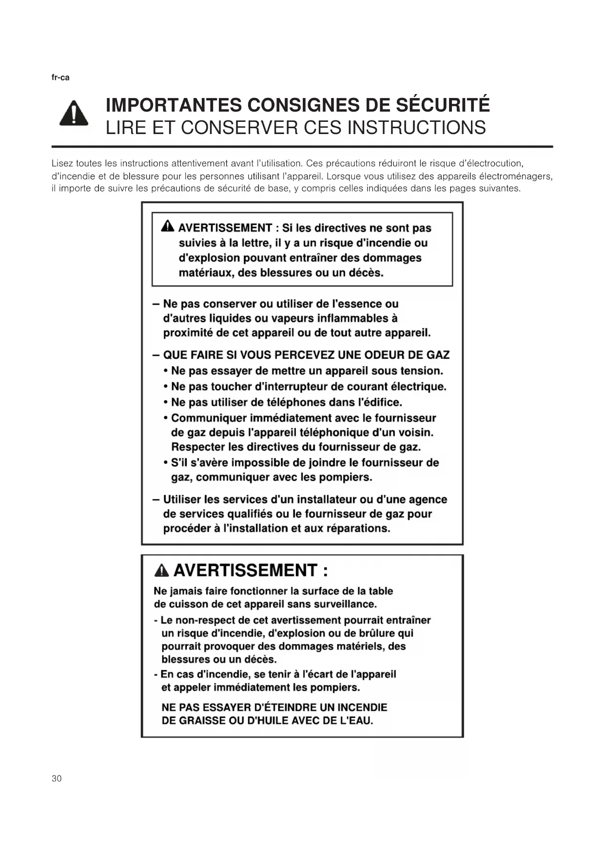 1.7 Sécurité des gaz AVERTISSEMENT Pour éviter l'accumulation de monoxyde de carbone, ne bloquez pas les orifices d'aération de l'appareil. AVERTISSEMENT Demandez à l'installateur de vous montrer où se trouve la vanne d'arrêt de gaz. Si un brûleur s'éteint et que du gaz s'échappe, ouvrez les fenêtres et les portes. Attendez que le gaz se dissipe avant d'utiliser l'appareil. Si vous sentez des effluves de gaz, l’installateur n’a pas correctement vérifié la présence de fuites. Si les raccordements de son pas parfaitement serrés, vous pouvez avoir une petite fuite et une faible odeur de gaz. Si vous sentez des effluves de gaz, éteindre immédiatement l'appareil et communiquer avec un fournisseur autorisé en réparation pour diagnostiquer le problème. Lisez l'AVERTISSEMENT sur l'odeur de gaz. AVERTISSEMENT Maintenez les ports de l’allumeur propre pour optimiser le rendement du brûleur. Il est nécessaire de nettoyer les ports de l’allumeur après un débordement ou quand le brûleur ne s’allume pas au déclenchement des allumeurs électroniques. Pour optimiser le rendement du brûleur, gardez les allumeurs propres et secs.