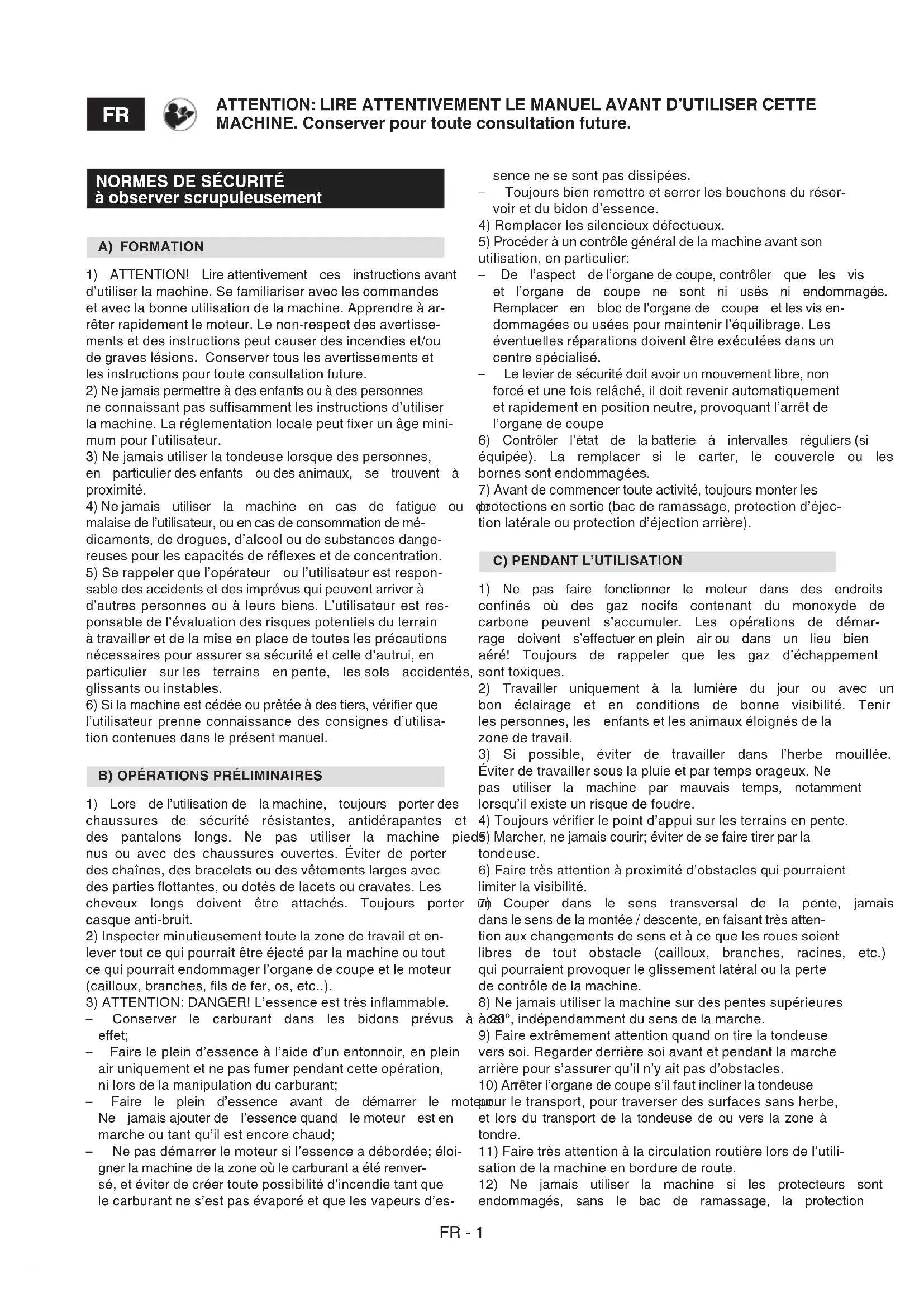 ATTENTION: LIRE ATTENTIVEMENT LE MANUEL AVANT D’UTILISER CETTE MACHINE. Conserver pour toute consultation future. sence ne se sont pas dissipées. – Toujours bien remettre et serrer les bouchons du réser- voir et du bidon d’essence. 4) Remplacer les silencieux défectueux. 5) Procéder à un contrôle général de la machine avant son utilisation, en particulier: – De l’aspect de l’organe de coupe, contrôler que les vis et l’organe de coupe ne sont ni usés ni endommagés. Remplacer en bloc de l’organe de coupe et les vis en- dommagées ou usées pour maintenir l’équilibrage. Les éventuelles réparations doivent être exécutées dans un centre spécialisé. – Le levier de sécurité doit avoir un mouvement libre, non forcé et une fois relâché, il doit revenir automatiquement et rapidement en position neutre, provoquant l’arrêt de l’organe de coupe 6) Contrôler l’état de la batterie à intervalles réguliers (si équipée). La remplacer si le carter, le couvercle ou les bornes sont endommagées. 7) Avant de commencer toute activité, toujours monter les protections en sortie (bac de ramassage, protection d’éjec- tion latérale ou protection d’éjection arrière).