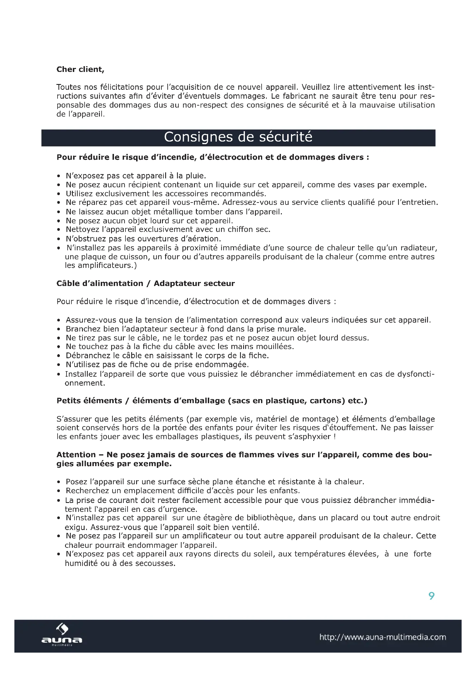 - Installez l’appareil de sorte que vous puissiez le débrancher immédiatement en cas de dysfoncti- onnement. Petits éléments / éléments d’emballage (sacs en plastique, cartons) etc.) S’assurer que les petits éléments (par exemple vis, matériel de montage) et éléments d’emballage soient conservés hors de la portée des enfants pour éviter les risques d‘étouement. Ne pas laisser les enfants jouer avec les emballages plastiques, ils peuvent s’asphyxier ! Attention – Ne posez jamais de sources de ammes vives sur l’appareil, comme des bou- gies allumées par exemple.