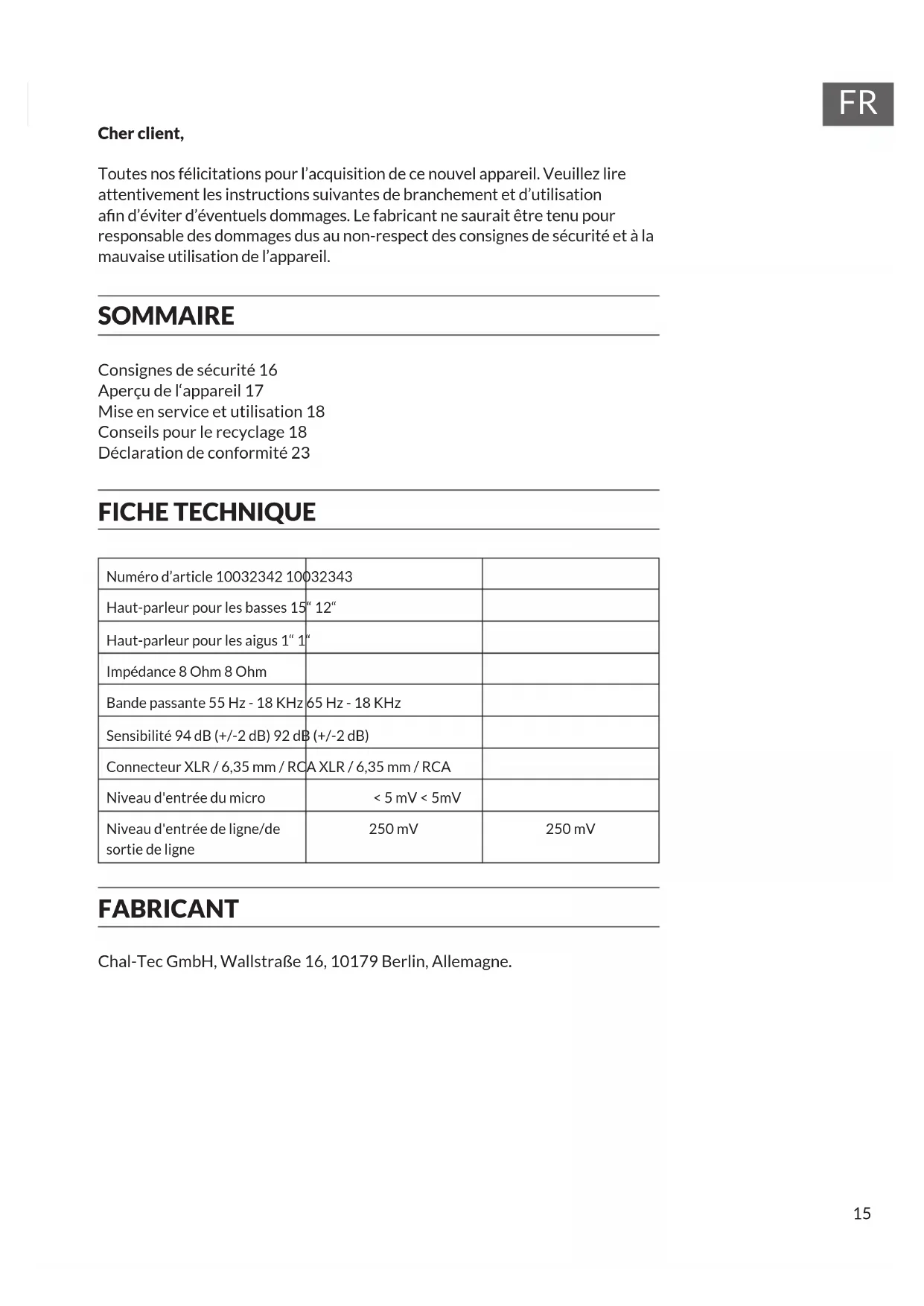 Cher client, Toutes nos félicitations pour l’acquisition de ce nouvel appareil. Veuillez lire attentivement les instructions suivantes de branchement et d’utilisation an d’éviter d’éventuels dommages. Le fabricant ne saurait être tenu pour responsable des dommages dus au non-respect des consignes de sécurité et à la mauvaise utilisation de l’appareil. SOMMAIRE Consignes de sécurité 16 Aperçu de l‘appareil 17 Mise en service et utilisation 18 Conseils pour le recyclage 18 Déclaration de conformité 23 FICHE TECHNIQUE Numéro d’article 10032342 10032343 Haut-parleur pour les basses 15“ 12“ Haut-parleur pour les aigus 1“ 1“ Impédance 8 Ohm 8 Ohm Bande passante 55 Hz - 18 KHz 65 Hz - 18 KHz Sensibilité 94 dB (+/-2 dB) 92 dB (+/-2 dB) Connecteur XLR / 6,35 mm / RCA XLR / 6,35 mm / RCA Niveau d'entrée du micro < 5 mV < 5mV Niveau d'entrée de ligne/de sortie de ligne 250 mV 250 mV FABRICANT Chal-Tec GmbH, Wallstraße 16, 10179 Berlin, Allemagne.16