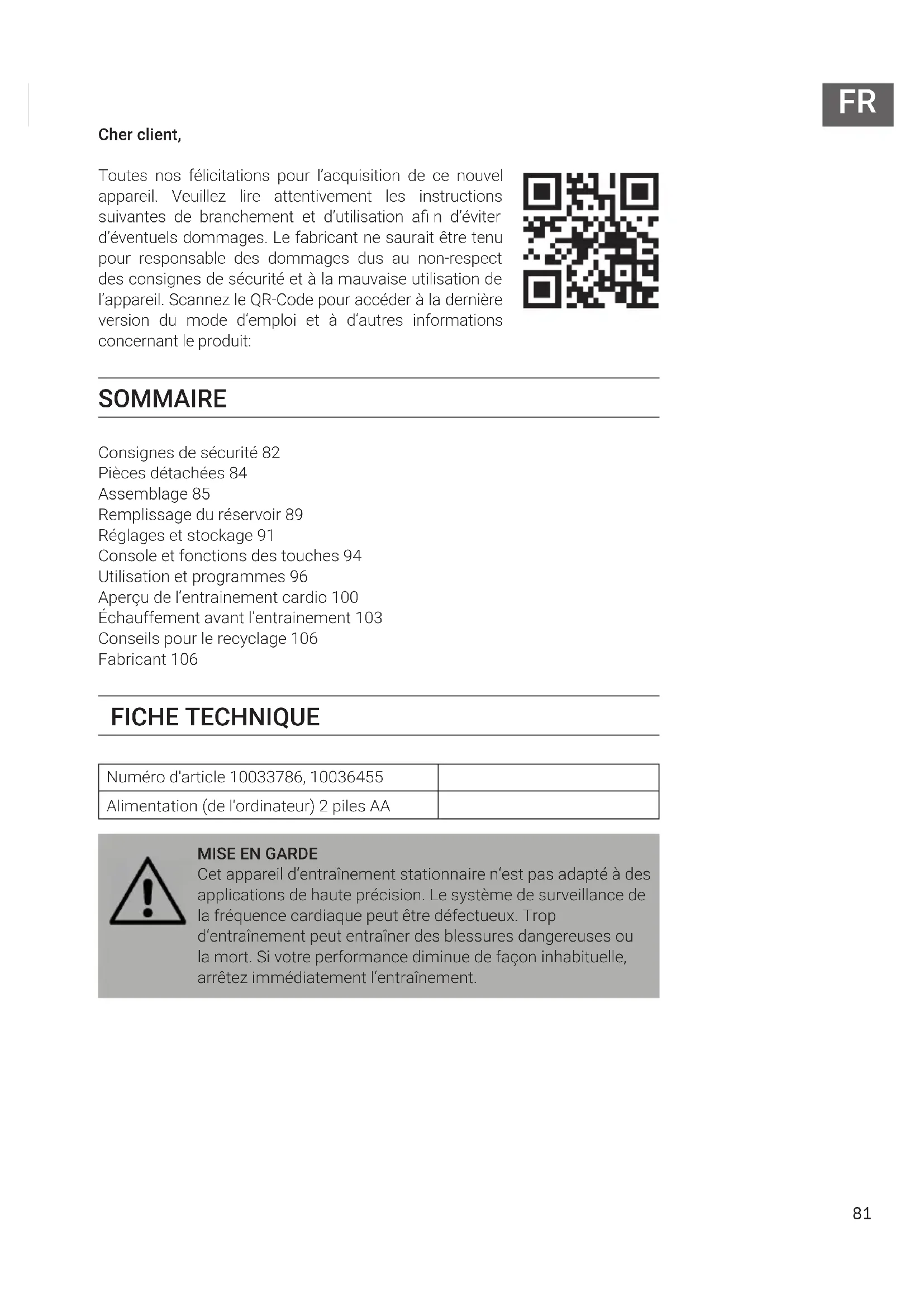 Cher client, Toutes nos félicitations pour l’acquisition de ce nouvel appareil. Veuillez lire attentivement les instructions suivantes de branchement et d’utilisation a n d’éviter d’éventuels dommages. Le fabricant ne saurait être tenu pour responsable des dommages dus au non-respect des consignes de sécurité et à la mauvaise utilisation de l’appareil. Scannez le QR-Code pour accéder à la dernière version du mode d‘emploi et à d‘autres informations concernant le produit: SOMMAIRE Consignes de sécurité 82 Pièces détachées 84 Assemblage 85 Remplissage du réservoir 89 Réglages et stockage 91 Console et fonctions des touches 94 Utilisation et programmes 96 Aperçu de l‘entrainement cardio 100 Échauffement avant l‘entrainement 103 Conseils pour le recyclage 106 Fabricant 106 FICHE TECHNIQUE Numéro d'article 10033786, 10036455 Alimentation (de l'ordinateur) 2 piles AA