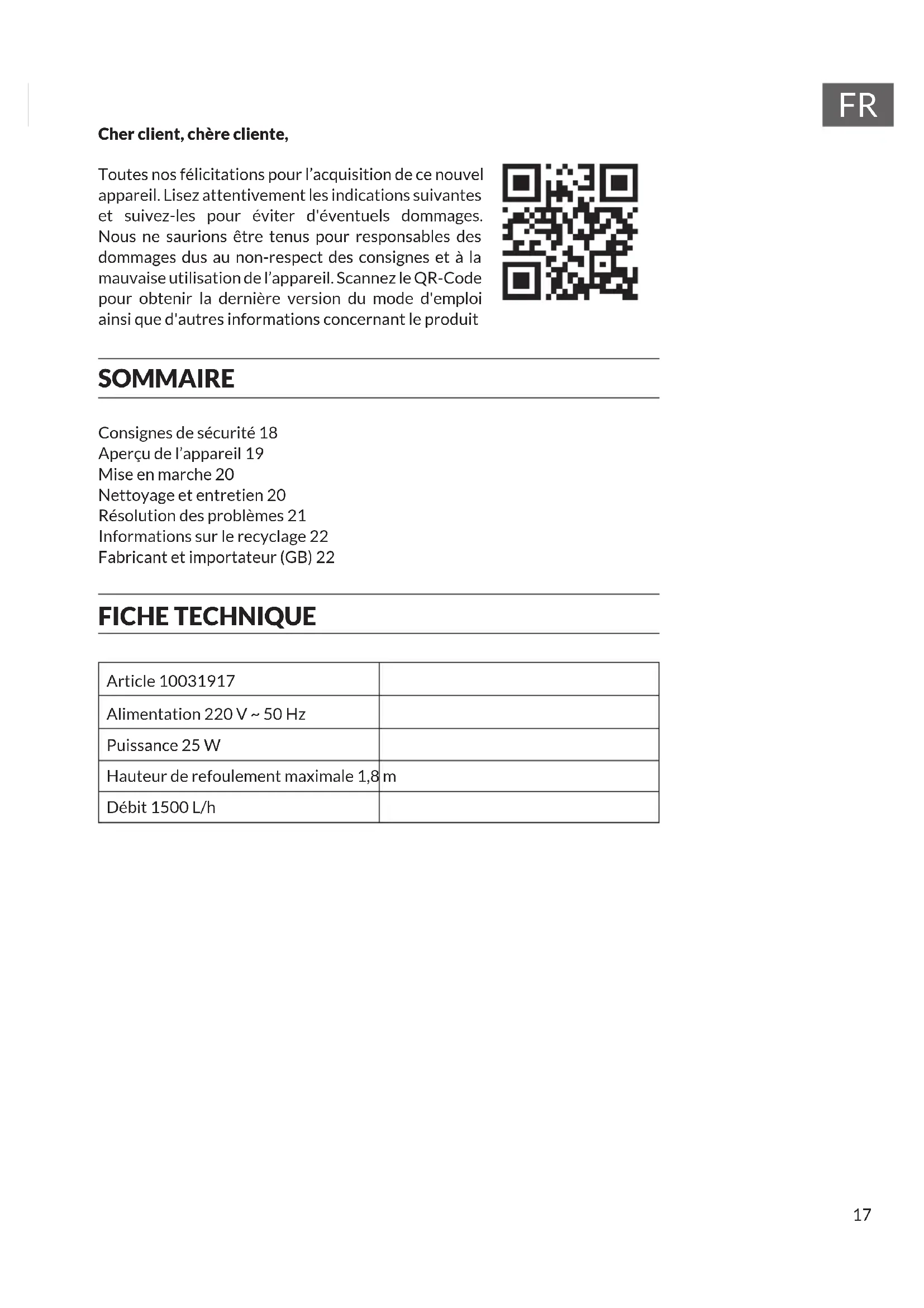 Cher client, chère cliente, Toutes nos félicitations pour l’acquisition de ce nouvel appareil. Lisez attentivement les indications suivantes et suivez-les pour éviter d'éventuels dommages. Nous ne saurions être tenus pour responsables des dommages dus au non-respect des consignes et à la mauvaise utilisation de l’appareil. Scannez le QR-Code pour obtenir la dernière version du mode d'emploi ainsi que d'autres informations concernant le produit SOMMAIRE Consignes de sécurité 18 Aperçu de l’appareil 19 Mise en marche 20 Nettoyage et entretien 20 Résolution des problèmes 21 Informations sur le recyclage 22 Fabricant et importateur (GB) 22 FICHE TECHNIQUE Article 10031917 Alimentation 220 V ~ 50 Hz Puissance 25 W Hauteur de refoulement maximale 1,8 m Débit 1500 L/h18