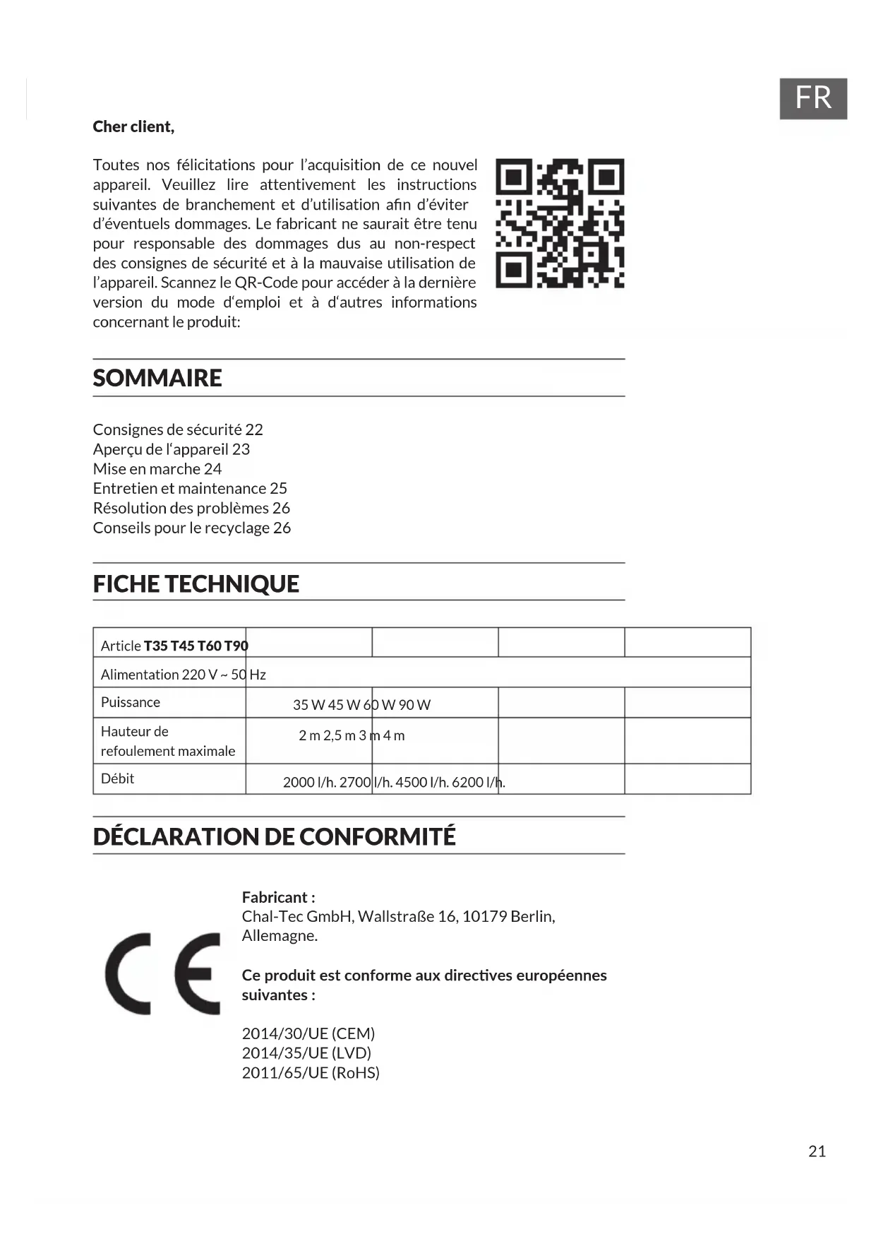 Cher client, Toutes nos félicitations pour l’acquisition de ce nouvel appareil. Veuillez lire attentivement les instructions suivantes de branchement et d’utilisation an d’éviter d’éventuels dommages. Le fabricant ne saurait être tenu pour responsable des dommages dus au non-respect des consignes de sécurité et à la mauvaise utilisation de l’appareil. Scannez le QR-Code pour accéder à la dernière version du mode d‘emploi et à d‘autres informations concernant le produit: SOMMAIRE Consignes de sécurité 22 Aperçu de l‘appareil 23 Mise en marche 24 Entretien et maintenance 25 Résolution des problèmes 26 Conseils pour le recyclage 26 FICHE TECHNIQUE Article T35 T45 T60 T90 Alimentation 220 V ~ 50 Hz Puissance 35 W 45 W 60 W 90 W Hauteur de refoulement maximale 2 m 2,5 m 3 m 4 m Débit 2000 l/h. 2700 l/h. 4500 l/h. 6200 l/h.