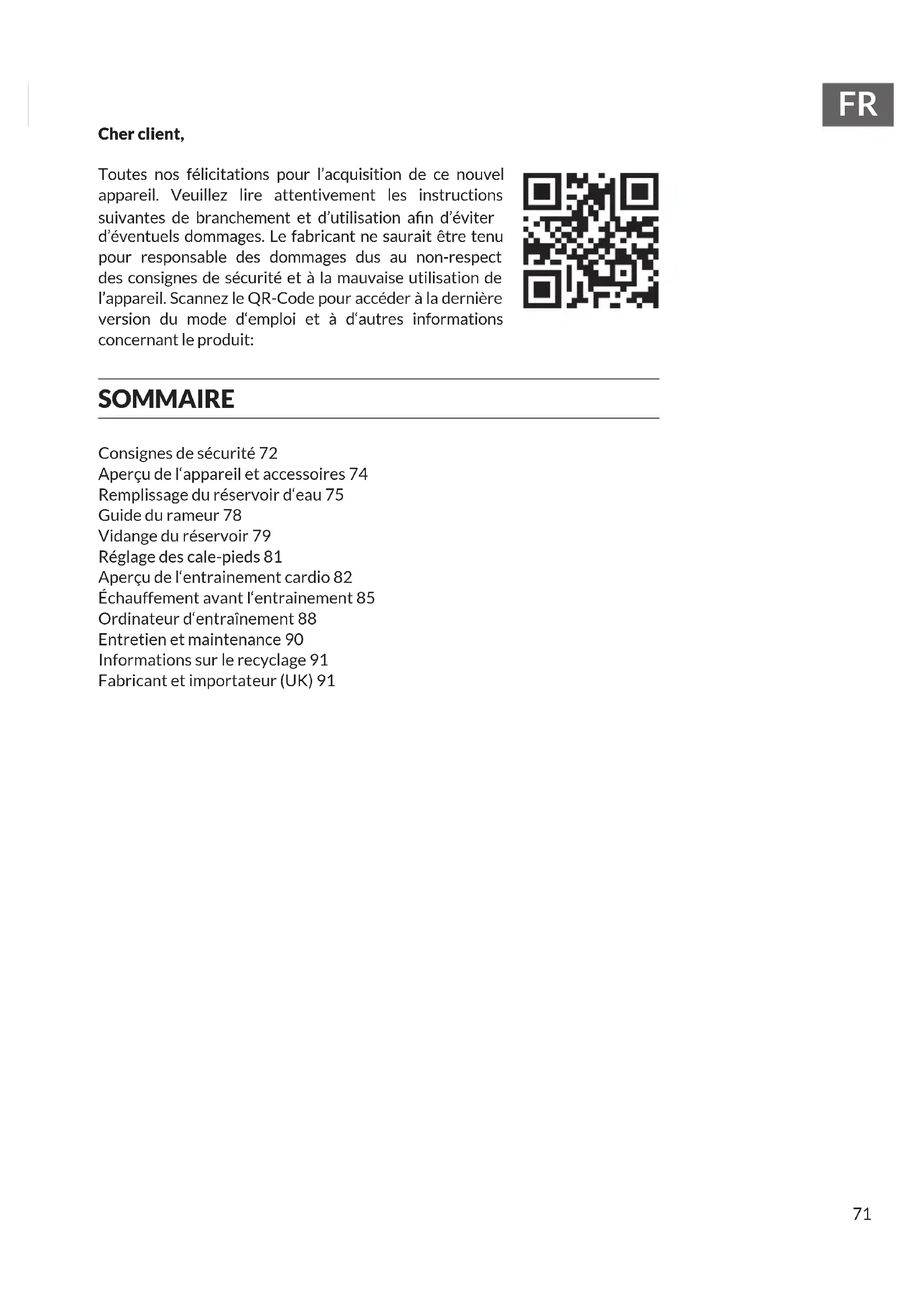 Cher client, Toutes nos félicitations pour l’acquisition de ce nouvel appareil. Veuillez lire attentivement les instructions suivantes de branchement et d’utilisation an d’éviter d’éventuels dommages. Le fabricant ne saurait être tenu pour responsable des dommages dus au non-respect des consignes de sécurité et à la mauvaise utilisation de l’appareil. Scannez le QR-Code pour accéder à la dernière version du mode d‘emploi et à d‘autres informations concernant le produit: SOMMAIRE Consignes de sécurité 72 Aperçu de l‘appareil et accessoires 74 Remplissage du réservoir d‘eau 75 Guide du rameur 78 Vidange du réservoir 79 Réglage des cale-pieds 81 Aperçu de l‘entrainement cardio 82 Échauffement avant l‘entrainement 85 Ordinateur d‘entraînement 88 Entretien et maintenance 90 Informations sur le recyclage 91 Fabricant et importateur (UK) 9172