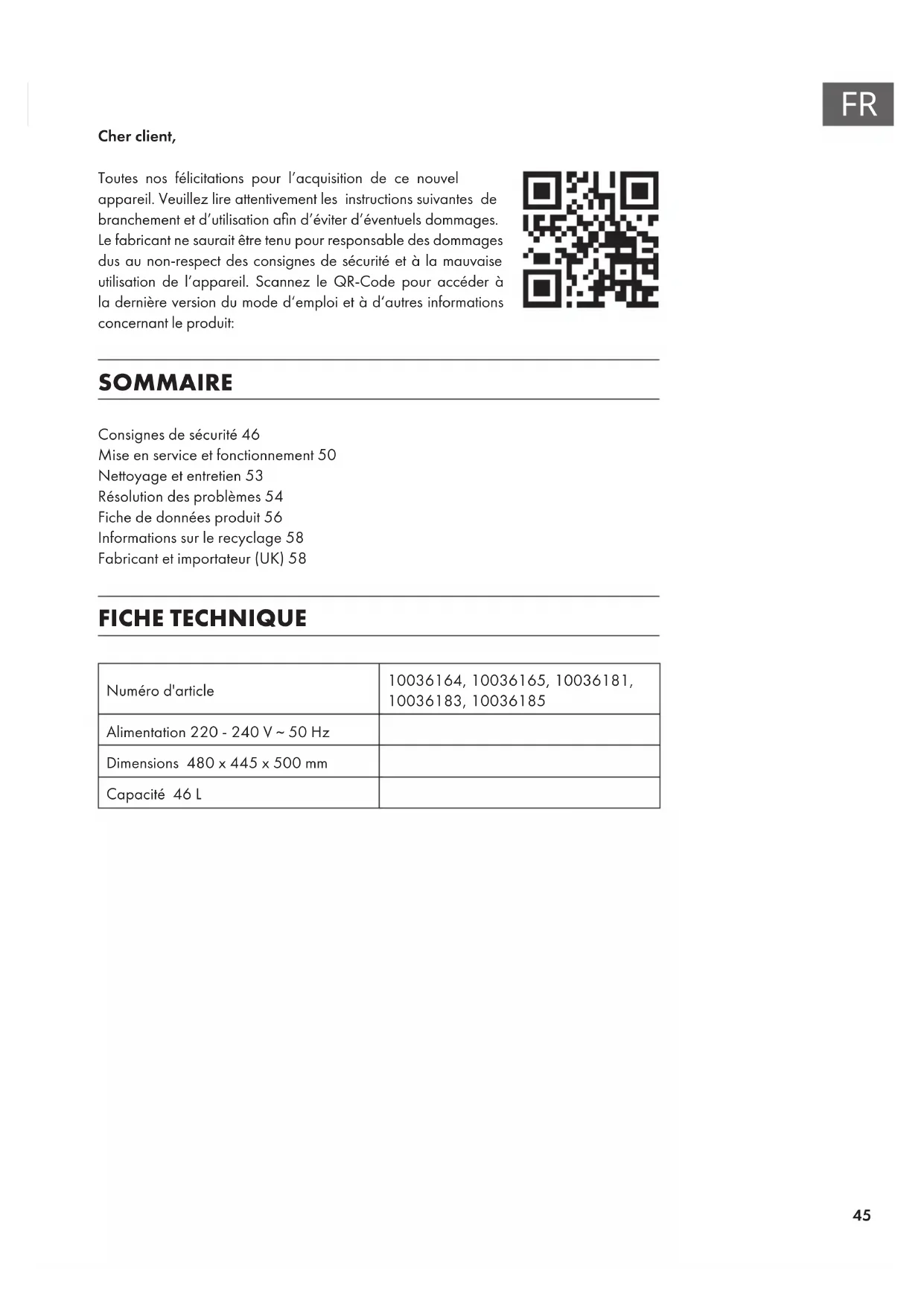 Cher client, Toutes nos félicitations pour l’acquisition de ce nouvel appareil. Veuillez lire attentivement les instructions suivantes de branchement et d’utilisation an d’éviter d’éventuels dommages. Le fabricant ne saurait être tenu pour responsable des dommages dus au non-respect des consignes de sécurité et à la mauvaise utilisation de l’appareil. Scannez le QR-Code pour accéder à la dernière version du mode d‘emploi et à d‘autres informations concernant le produit: SOMMAIRE Consignes de sécurité46 Mise en service et fonctionnement50 Nettoyage et entretien53 Résolution des problèmes54 Fiche de données produit56 Informations sur le recyclage58 Fabricant et importateur (UK)58 FICHE TECHNIQUE Numéro d'article 10036164, 10036165, 10036181, 10036183, 10036185 Alimentation 220 - 240 V ~ 50 Hz Dimensions 480 x 445 x 500 mm Capacité 46 L46