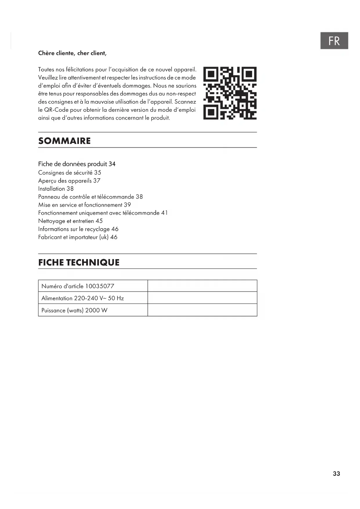 Chère cliente, cher client, Toutes nos félicitations pour l’acquisition de ce nouvel appareil. Veuillez lire attentivement et respecter les instructions de ce mode d’emploi an d’éviter d’éventuels dommages. Nous ne saurions être tenus pour responsables des dommages dus au non-respect des consignes et à la mauvaise utilisation de l’appareil. Scannez le QR-Code pour obtenir la dernière version du mode d‘emploi ainsi que d‘autres informations concernant le produit. SOMMAIRE FICHE TECHNIQUE Numéro d'article 10035077 Alimentation 220-240 V~ 50 Hz Puissance (watts) 2000 W Fiche de données produit 34 Consignes de sécurité35 Aperçu des appareils37 Installation38 Panneau de contrôle et télécommande38 Mise en service et fonctionnement39 Fonctionnement uniquement avec télécommande41 Nettoyage et entretien45 Informations sur le recyclage46 Fabricant et importateur (uk)4634