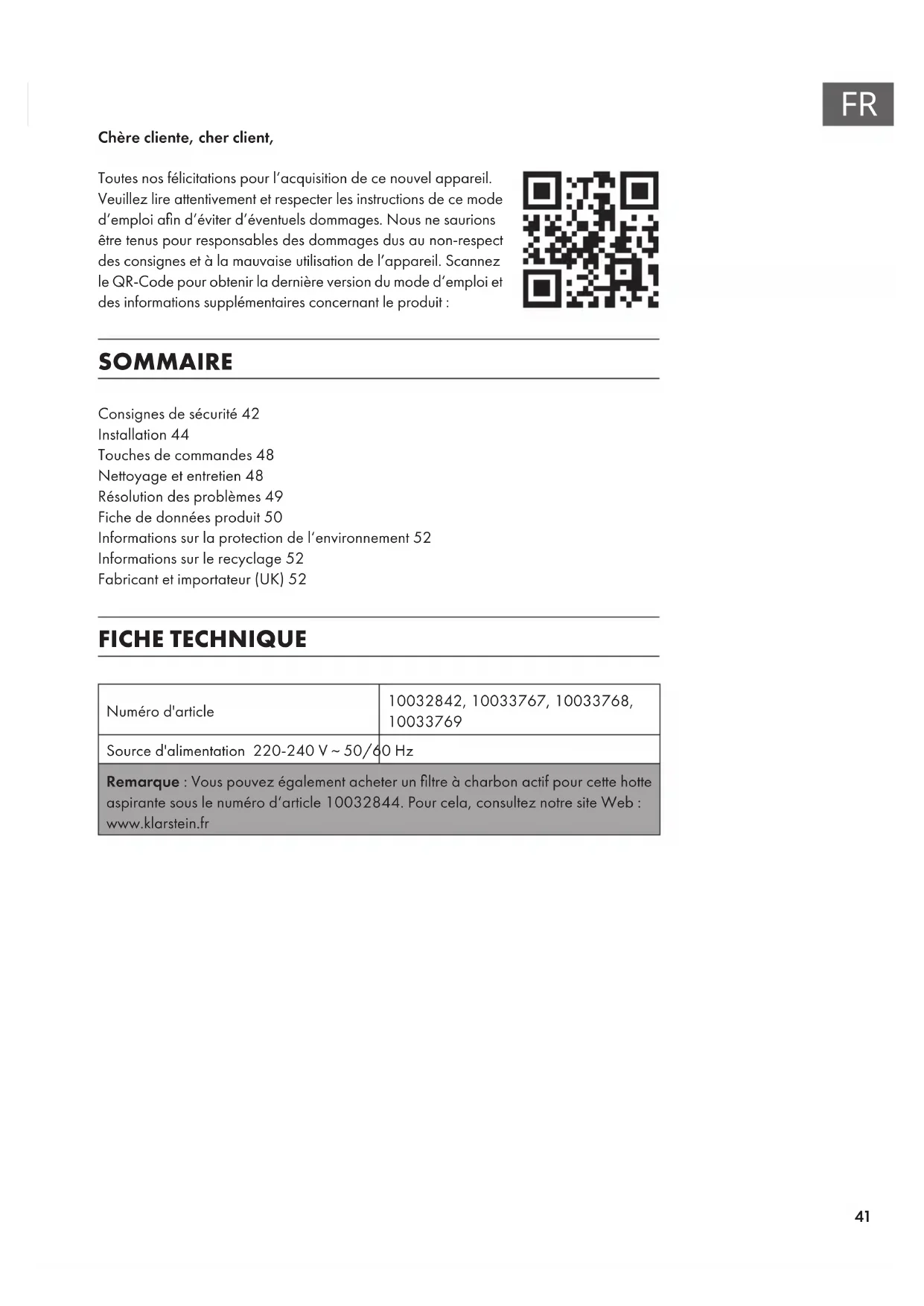 Chère cliente, cher client, Toutes nos félicitations pour l’acquisition de ce nouvel appareil. Veuillez lire attentivement et respecter les instructions de ce mode d’emploi an d’éviter d’éventuels dommages. Nous ne saurions être tenus pour responsables des dommages dus au non-respect des consignes et à la mauvaise utilisation de l’appareil. Scannez le QR-Code pour obtenir la dernière version du mode d‘emploi et des informations supplémentaires concernant le produit : SOMMAIRE Consignes de sécurité42 Installation44 Touches de commandes48 Nettoyage et entretien48 Résolution des problèmes49 Fiche de données produit50 Informations sur la protection de l‘environnement52 Informations sur le recyclage52 Fabricant et importateur (UK)52 FICHE TECHNIQUE Numéro d'article 10032842, 10033767, 10033768,