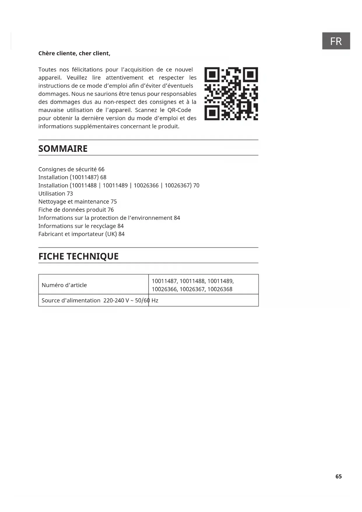 Chère cliente, cher client, Toutes nos félicitations pour l’acquisition de ce nouvel appareil. Veuillez lire attentivement et respecter les instructions de ce mode d’emploi an d’éviter d’éventuels dommages. Nous ne saurions être tenus pour responsables des dommages dus au non-respect des consignes et à la mauvaise utilisation de l’appareil. Scannez le QR-Code pour obtenir la dernière version du mode d‘emploi et des informations supplémentaires concernant le produit. SOMMAIRE Consignes de sécurité 66 Installation (10011487) 68 Installation (10011488 | 10011489 | 10026366 | 10026367) 70 Utilisation 73 Nettoyage et maintenance 75 Fiche de données produit 76 Informations sur la protection de l‘environnement 84 Informations sur le recyclage 84 Fabricant et importateur (UK) 84 FICHE TECHNIQUE Numéro d'article 10011487, 10011488, 10011489, 10026366, 10026367, 10026368 Source d'alimentation 220-240 V ~ 50/60 Hz66
