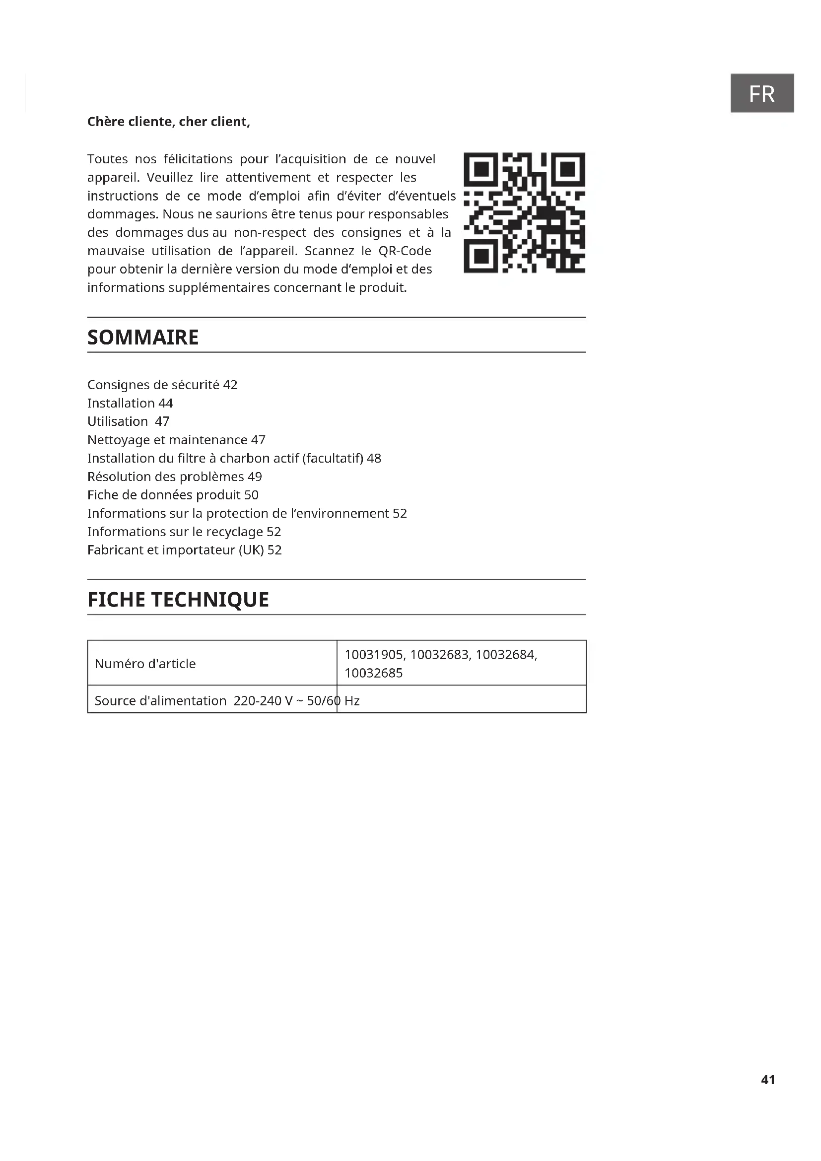 Chère cliente, cher client, Toutes nos félicitations pour l’acquisition de ce nouvel appareil. Veuillez lire attentivement et respecter les instructions de ce mode d’emploi an d’éviter d’éventuels dommages. Nous ne saurions être tenus pour responsables des dommages dus au non-respect des consignes et à la mauvaise utilisation de l’appareil. Scannez le QR-Code pour obtenir la dernière version du mode d‘emploi et des informations supplémentaires concernant le produit. SOMMAIRE Consignes de sécurité 42 Installation 44 Utilisation 47 Nettoyage et maintenance 47 Installation du ltre à charbon actif (facultatif) 48 Résolution des problèmes 49 Fiche de données produit 50 Informations sur la protection de l‘environnement 52 Informations sur le recyclage 52 Fabricant et importateur (UK) 52 FICHE TECHNIQUE Numéro d'article 10031905, 10032683, 10032684,