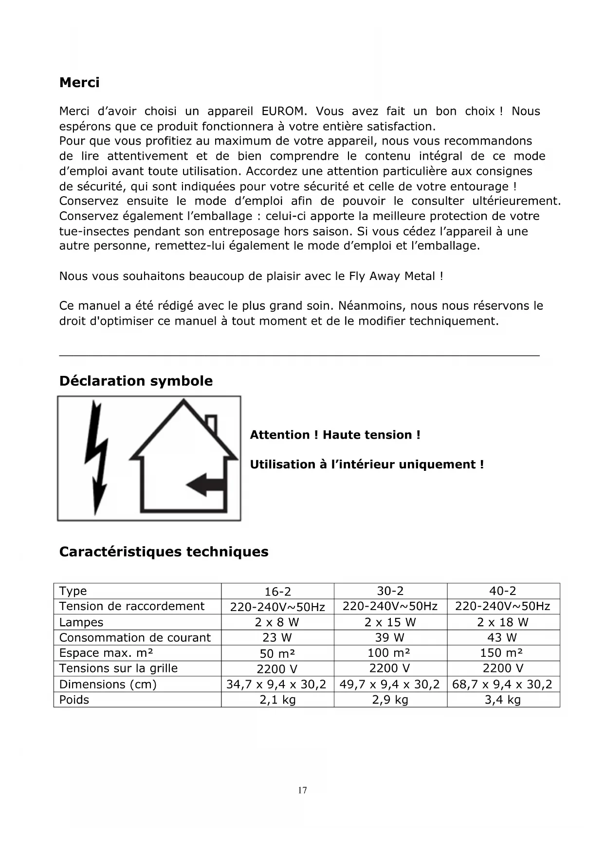 Merci Merci d’avoir choisi un appareil EUROM. Vous avez fait un bon choix ! Nous espérons que ce produit fonctionnera à votre entière satisfaction. Pour que vous profitiez au maximum de votre appareil, nous vous recommandons de lire attentivement et de bien comprendre le contenu intégral de ce mode d’emploi avant toute utilisation. Accordez une attention particulière aux consignes de sécurité, qui sont indiquées pour votre sécurité et celle de votre entourage ! Conservez ensuite le mode d’emploi afin de pouvoir le consulter ultérieurement. Conservez également l’emballage : celui-ci apporte la meilleure protection de votre tue-insectes pendant son entreposage hors saison. Si vous cédez l’appareil à une autre personne, remettez-lui également le mode d’emploi et l’emballage. Nous vous souhaitons beaucoup de plaisir avec le Fly Away Metal ! Ce manuel a été rédigé avec le plus grand soin. Néanmoins, nous nous réservons le droit d'optimiser ce manuel à tout moment et de le modifier techniquement.