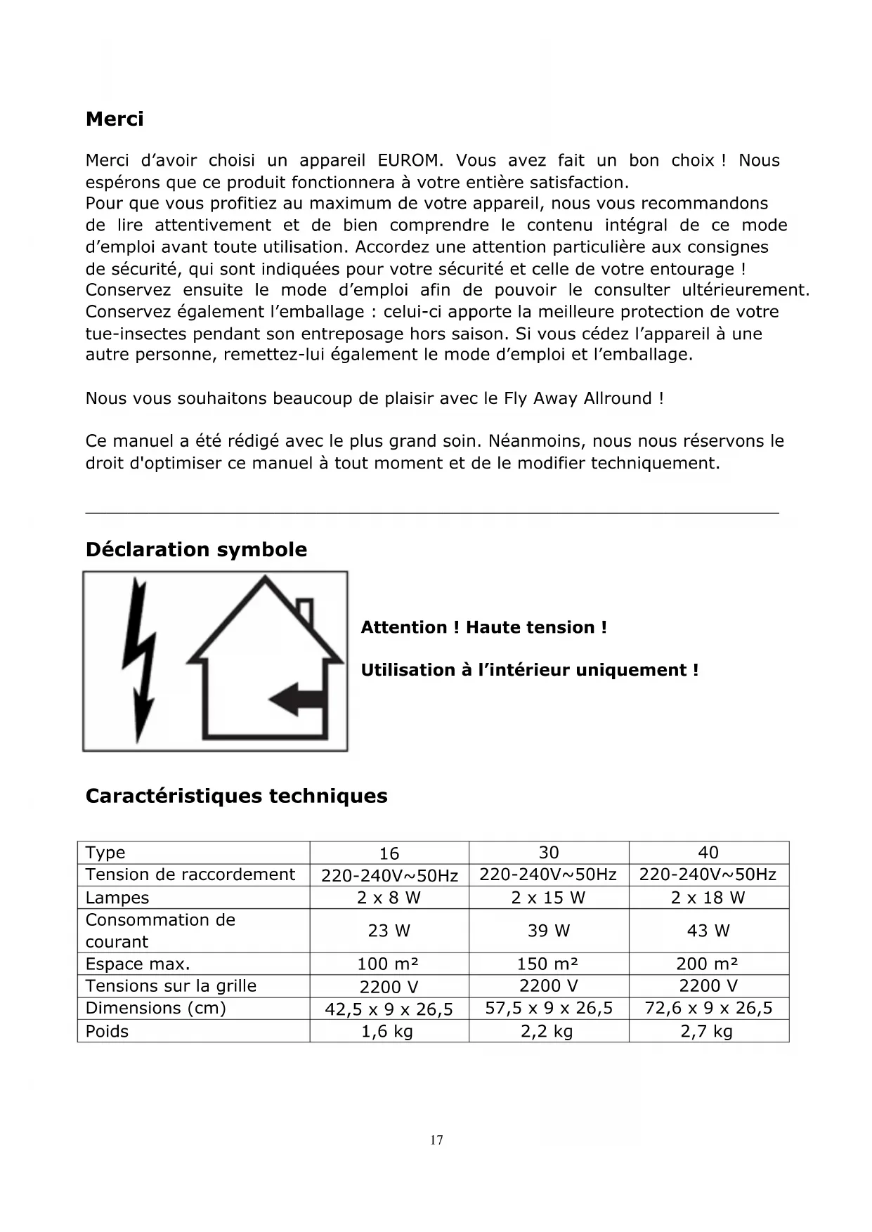 Merci Merci d’avoir choisi un appareil EUROM. Vous avez fait un bon choix ! Nous espérons que ce produit fonctionnera à votre entière satisfaction. Pour que vous profitiez au maximum de votre appareil, nous vous recommandons de lire attentivement et de bien comprendre le contenu intégral de ce mode d’emploi avant toute utilisation. Accordez une attention particulière aux consignes de sécurité, qui sont indiquées pour votre sécurité et celle de votre entourage ! Conservez ensuite le mode d’emploi afin de pouvoir le consulter ultérieurement. Conservez également l’emballage : celui-ci apporte la meilleure protection de votre tue-insectes pendant son entreposage hors saison. Si vous cédez l’appareil à une autre personne, remettez-lui également le mode d’emploi et l’emballage. Nous vous souhaitons beaucoup de plaisir avec le Fly Away Allround ! Ce manuel a été rédigé avec le plus grand soin. Néanmoins, nous nous réservons le droit d'optimiser ce manuel à tout moment et de le modifier techniquement.