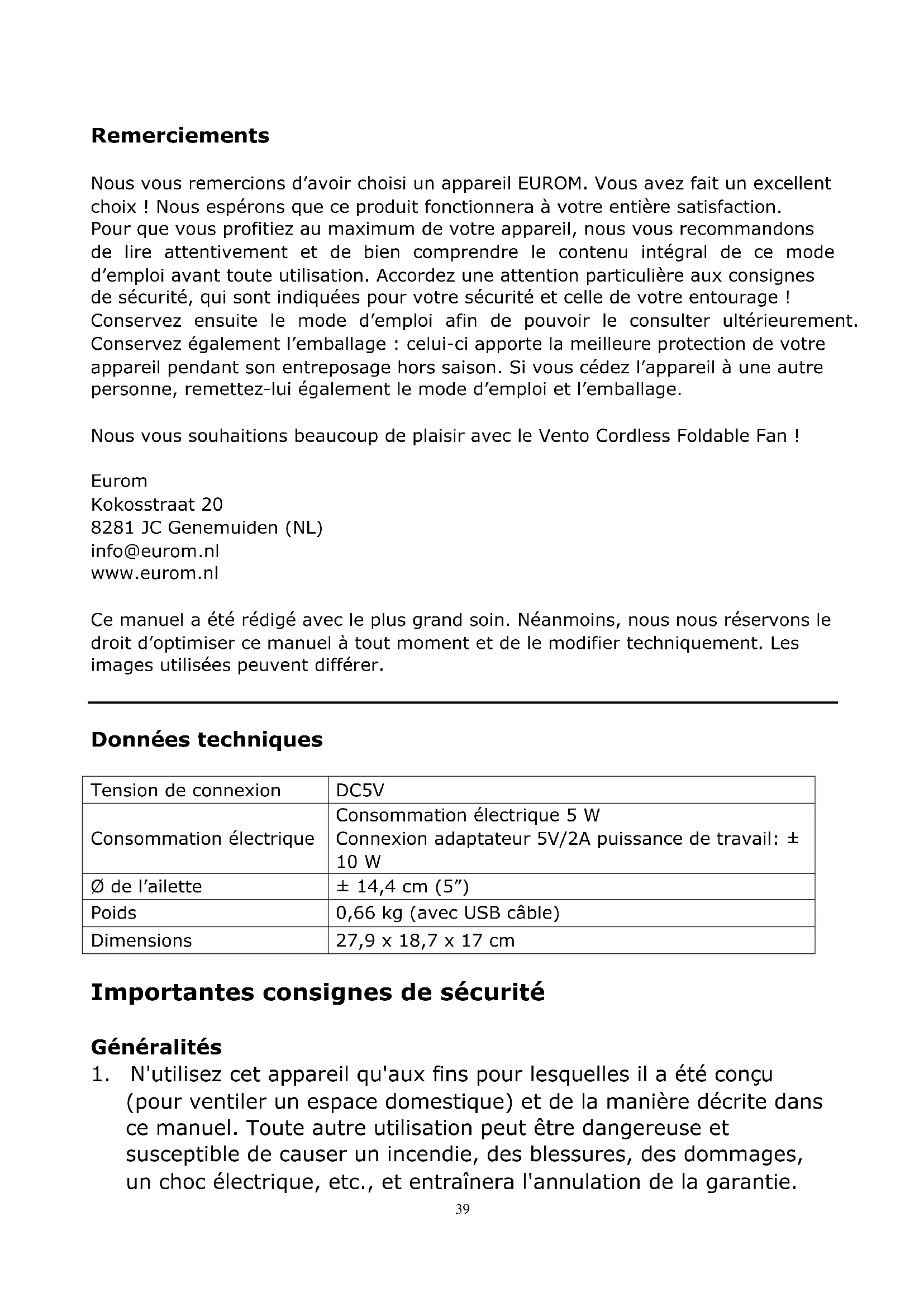 Remerciements Nous vous remercions d’avoir choisi un appareil EUROM. Vous avez fait un excellent choix ! Nous espérons que ce produit fonctionnera à votre entière satisfaction. Pour que vous profitiez au maximum de votre appareil, nous vous recommandons de lire attentivement et de bien comprendre le contenu intégral de ce mode d’emploi avant toute utilisation. Accordez une attention particulière aux consignes de sécurité, qui sont indiquées pour votre sécurité et celle de votre entourage ! Conservez ensuite le mode d’emploi afin de pouvoir le consulter ultérieurement. Conservez également l’emballage : celui-ci apporte la meilleure protection de votre appareil pendant son entreposage hors saison. Si vous cédez l’appareil à une autre personne, remettez-lui également le mode d’emploi et l’emballage. Nous vous souhaitions beaucoup de plaisir avec le Vento Cordless Foldable Fan ! Eurom Kokosstraat 20 8281 JC Genemuiden (NL) info@eurom.nl www.eurom.nl Ce manuel a été rédigé avec le plus grand soin. Néanmoins, nous nous réservons le droit d’optimiser ce manuel à tout moment et de le modifier techniquement. Les images utilisées peuvent différer.