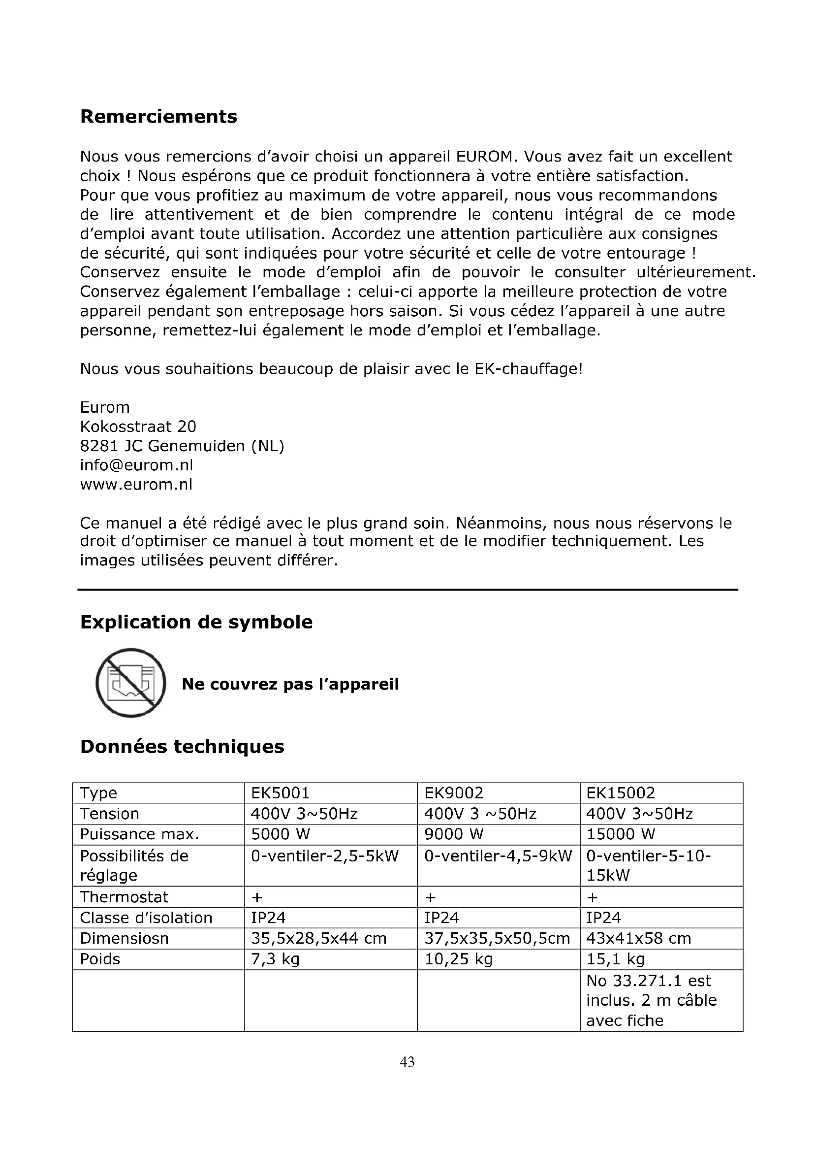 - À droite, le bouton de thermostat à réglage progressif. Le panneau du EK9002 et du EK15002 comportent également le point de réinitialisation (voir : « Protections »). Emplacement et branchement Enlevez la totalité de l’emballage et tenez-le hors de portée des enfants. Après avoir enlevé l’emballage, contrôlez si l’appareil ne présente pas de dommages ou de signes pouvant indiquer tout vice/défaut/panne. En cas de doute, n’utilisez pas l’appareil et adressez-vous à votre fournisseur en vue d’un contrôle/remplacement. Sélectionnez un emplacement approprié pour l’appareil en tenant compte de tous les avertissements susmentionnés de ce manuel. Assurez-vous que le radiateur soit éteint (interrupteur sur « OFF »), puis insérez la fiche dans une prise de courant 400 V-50 Hz en bon état de fonctionnement. Branchez ce radiateur uniquement sur une prise mise à la terre ! Mise en service et fonctionnement À la première mise en service du radiateur (ou lorsque vous souhaitez à nouveau régler la température souhaitée), tournez le bouton de thermostat sur la position maximum (le plus loin possible dans le sens des aiguilles d’une montre). À présent, mettez en marche le radiateur en mettant le bouton de fonction sur la position souhaitée : ventilateur uniquement, basse puissance (moyenne puissance) ou haute puissance. Lorsque la pièce est à la température souhaitée, tournez lentement le bouton de thermostat dans le sens inverse des aiguilles d’une montre, jusqu’à entendre un léger clic ; laissez le bouton sur cette position. À présent, le radiateur maintient automatiquement la température à ce niveau en allumant et en éteignant les éléments chauffants en cas de hausse ou de baisse excessive de la température. Si vous le souhaitez, vous pouvez à présent commuter sur une puissance inférieure. Pour éteindre le radiateur, mettez les interrupteurs sur « O » (arrêt). Le radiateur se met hors service. A présent, retirez la fiche de la prise de courant.51 Attention ! Le ventilateur continue à tourner lorsque le thermostat éteint les éléments chauffants. Ainsi, le radiateur maintient l’air ambiant en mouvement et est donc parfaitement capable de détecter si la pièce refroidit. Le bouton de thermostat est à réglage progressif. Le tourner dans le sens des aiguilles d’une montre permet de régler le radiateur sur une température plus élevée ; le tourner dans le sens inverse des aiguilles d’une montre permet de le régler sur une température plus basse. Le modèle EK 9002 & 15002 est pourvu d'un dispositif supplémentaire pour augmenter la sécurité et prolonger la durée de vie. Ce dispositif supplémentaire éteint le ventilateur du poêle lorsque la température dans le poêle est inférieure à 30 degrés Celsius. Lorsque vous éteignez le poêle en mettant le bouton de fonction sur 0, le ventilateur continue à fonctionner pendant 3 à 4 minutes jusqu'à ce que la température dans le poêle soit inférieure à 30 degrés Celsius. La fiche ne peut être retirée de la prise de courant que lorsque le ventilateur est arrêté. Protections La protection anti-surchauffe éteint le radiateur en cas de surchauffe interne. Lorsque la protection anti-surchauffe éteint le radiateur, mettez immédiatement le bouton de fonction sur « O », retirez la fiche de la prise de courant et laissez refroidir le radiateur pendant au moins 10 minutes. Après, vous devez maintenant commencer par réinitialiser les EK9002 et EK15002 en appuyant sur le bouton de réinitialisation. Ensuite, vous pouvez en principe l’utiliser à nouveau normalement. Cependant, toute surchauffe a généralement une cause : le radiateur ne peut diffuser suffisamment sa chaleur ou ne peut aspirer qu’une quantité insuffisante d’air frais (recouvrement, obstruction des grilles, installation trop près d’un mur, etc.). Avant de remettre le radiateur en service, réparez la cause de la surchauffe. Si le problème est récurrent ou que vous ne trouvez pas la cause de la surchauffe, cessez d’utiliser le radiateur et adressez-vous à votre fournisseur/électricien agréé en vue d’un contrôle/une réparation. Une surchauffe peut entraîner un risque d’incendie important !