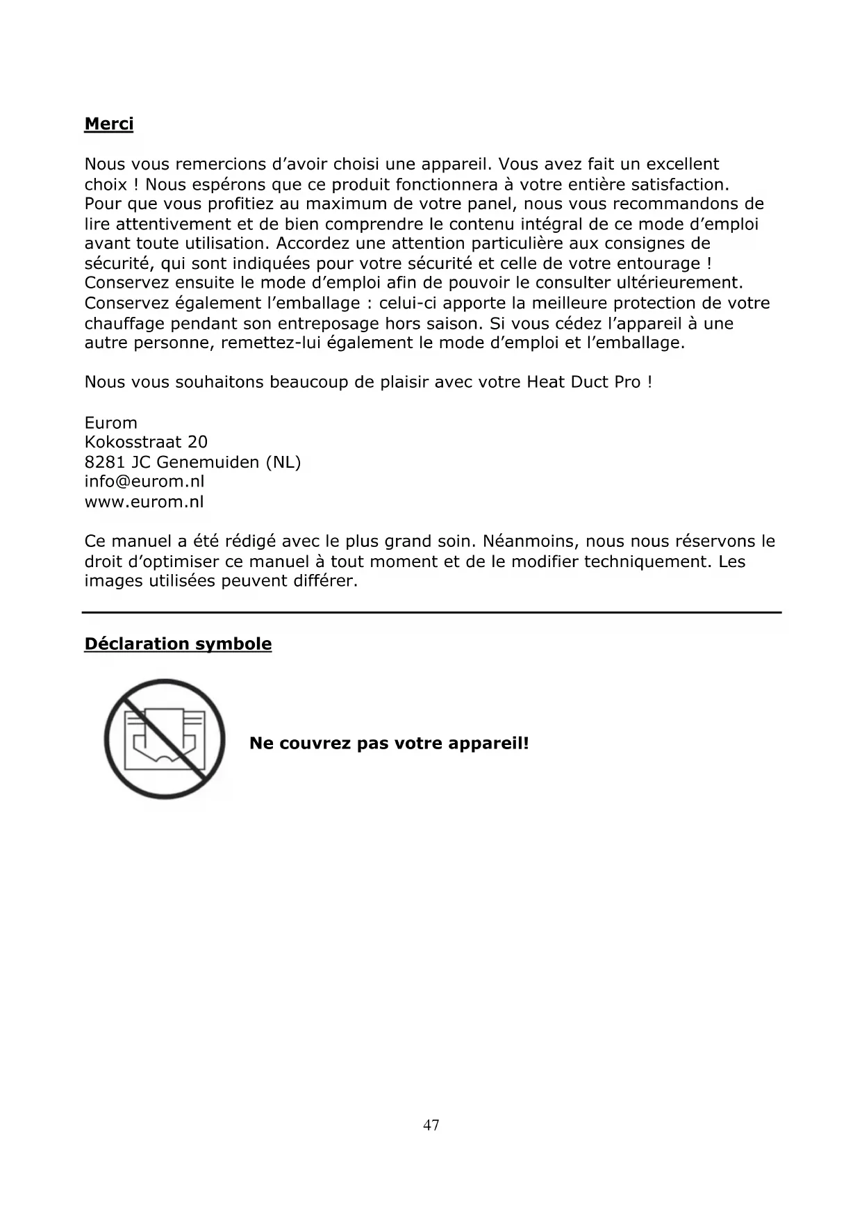 CE-statement See page 102.47 Merci Nous vous remercions d’avoir choisi une appareil. Vous avez fait un excellent choix ! Nous espérons que ce produit fonctionnera à votre entière satisfaction. Pour que vous profitiez au maximum de votre panel, nous vous recommandons de lire attentivement et de bien comprendre le contenu intégral de ce mode d’emploi avant toute utilisation. Accordez une attention particulière aux consignes de sécurité, qui sont indiquées pour votre sécurité et celle de votre entourage ! Conservez ensuite le mode d’emploi afin de pouvoir le consulter ultérieurement. Conservez également l’emballage : celui-ci apporte la meilleure protection de votre chauffage pendant son entreposage hors saison. Si vous cédez l’appareil à une autre personne, remettez-lui également le mode d’emploi et l’emballage. Nous vous souhaitons beaucoup de plaisir avec votre Heat Duct Pro ! Eurom Kokosstraat 20 8281 JC Genemuiden (NL) info@eurom.nl www.eurom.nl Ce manuel a été rédigé avec le plus grand soin. Néanmoins, nous nous réservons le droit d’optimiser ce manuel à tout moment et de le modifier techniquement. Les images utilisées peuvent différer.