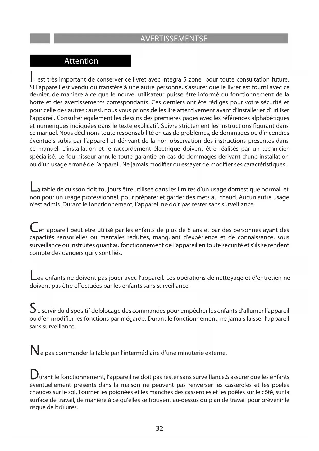 est très important de conserver ce livret avec Integra 5 zone pour toute consultation future. Si l’appareil est vendu ou transféré à une autre personne, s’assurer que le livret est fourni avec ce dernier, de manière à ce que le nouvel utilisateur puisse être informé du fonctionnement de la hotte et des avertissements correspondants. Ces derniers ont été rédigés pour votre sécurité et pour celle des autres; aussi, nous vous prions de les lire attentivement avant d’installer et d’utiliser l’appareil. Consulter également les dessins des premières pages avec les références alphabétiques et numériques indiquées dans le texte explicatif. Suivre strictement les instructions gurant dans ce manuel. Nous déclinons toute responsabilité en cas de problèmes, de dommages ou d’incendies éventuels subis par l’appareil et dérivant de la non observation des instructions présentes dans ce manuel. L’installation et le raccordement électrique doivent être réalisés par un technicien spécialisé. Le fournisseur annule toute garantie en cas de dommages dérivant d’une installation ou d’un usage erroné de l’appareil. Ne jamais modier ou essayer de modier ses caractéristiques.