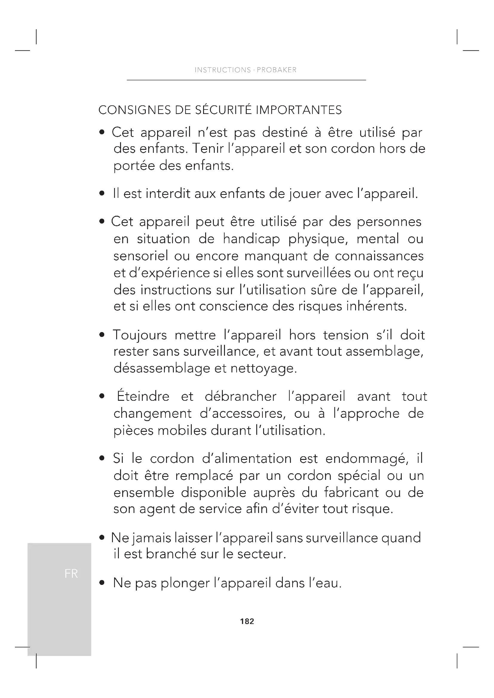 - Éviter tout contact avec les pièces mobiles. Tenir les mains, les cheveux, les vêtements, ainsi que les spatules et autres ustensiles éloignés du bol rotatif, du batteur, du fouet ou du crochet pétrisseur durant la marche afin d’éviter toute blessure et/ou tout dommage au robot.184